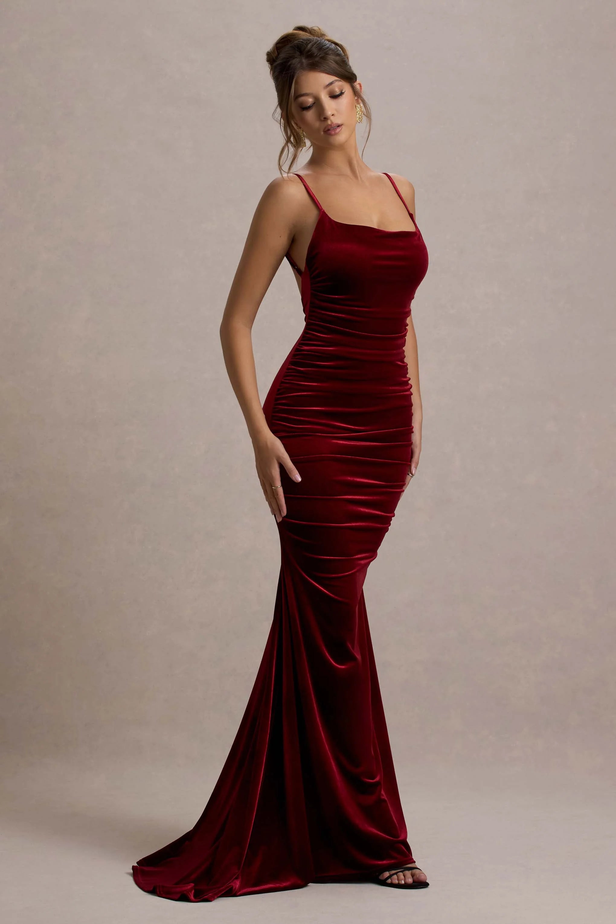 Who says the bride can solely bring the drama? Our latest maxi dress known as Adele is crafted from premium soft velvet in berry. A plunging back is supported from delicate straps which can be adjusted for the perfect fit whilst a fishtail skirt showcases a godet train from behind.