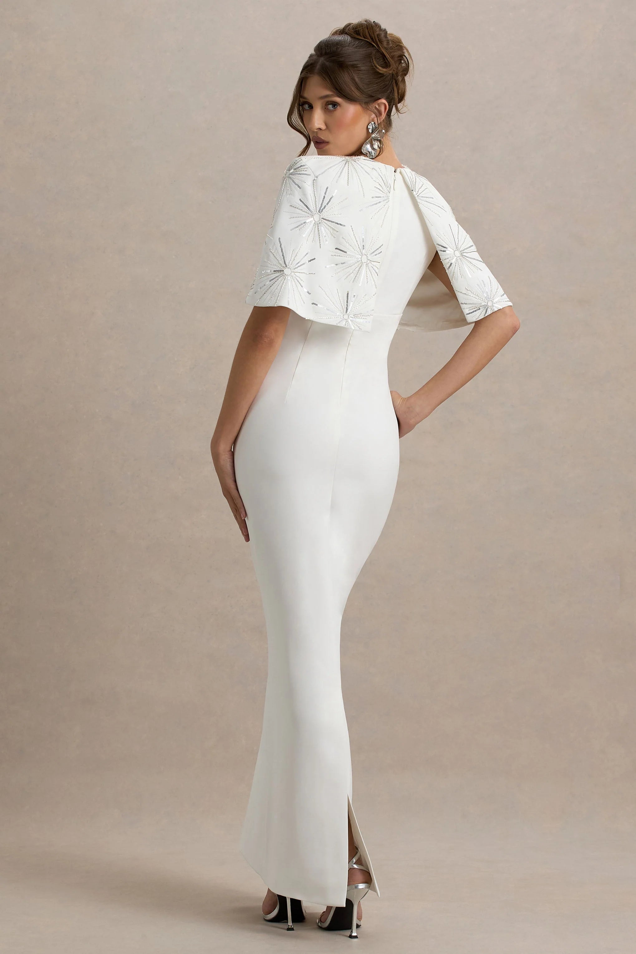 Be prepared to steal the spotlight and dazzle the night away in Agnella. This maxi is cut from our premium stretch crepe, to enhance your silhouette, in a timeless shade of white. Boasting a plunge neckline and featuring a statement embellished cape, that exudes elegance and allure, for the ultimate chic finish. This occasion piece is perfect for your next black tie event paired with sleek heels and a shimmering clutch bag, for a look that'll turn heads.