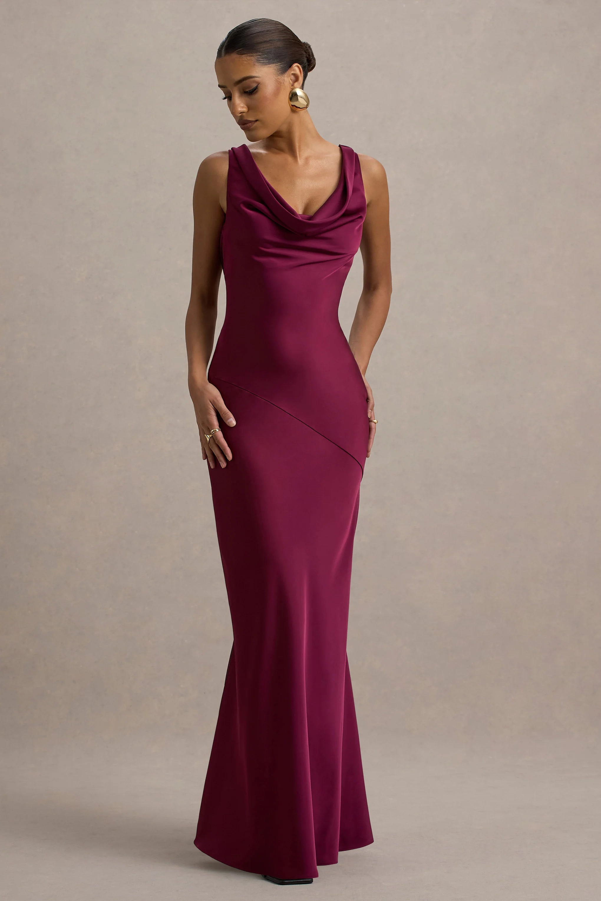 Introducing a captivating blend of simplicity and allure is Alesso. Arriving in a rich burgundy shade of of our premium satin that drapes over your curves creating a flattering elegant silhouette. Alesso features a cowl neckline and alluring cowl back with a self tie strap to adjust for the perfect fit, styles yours with a tousled bun for the ultimate wedding guest look.