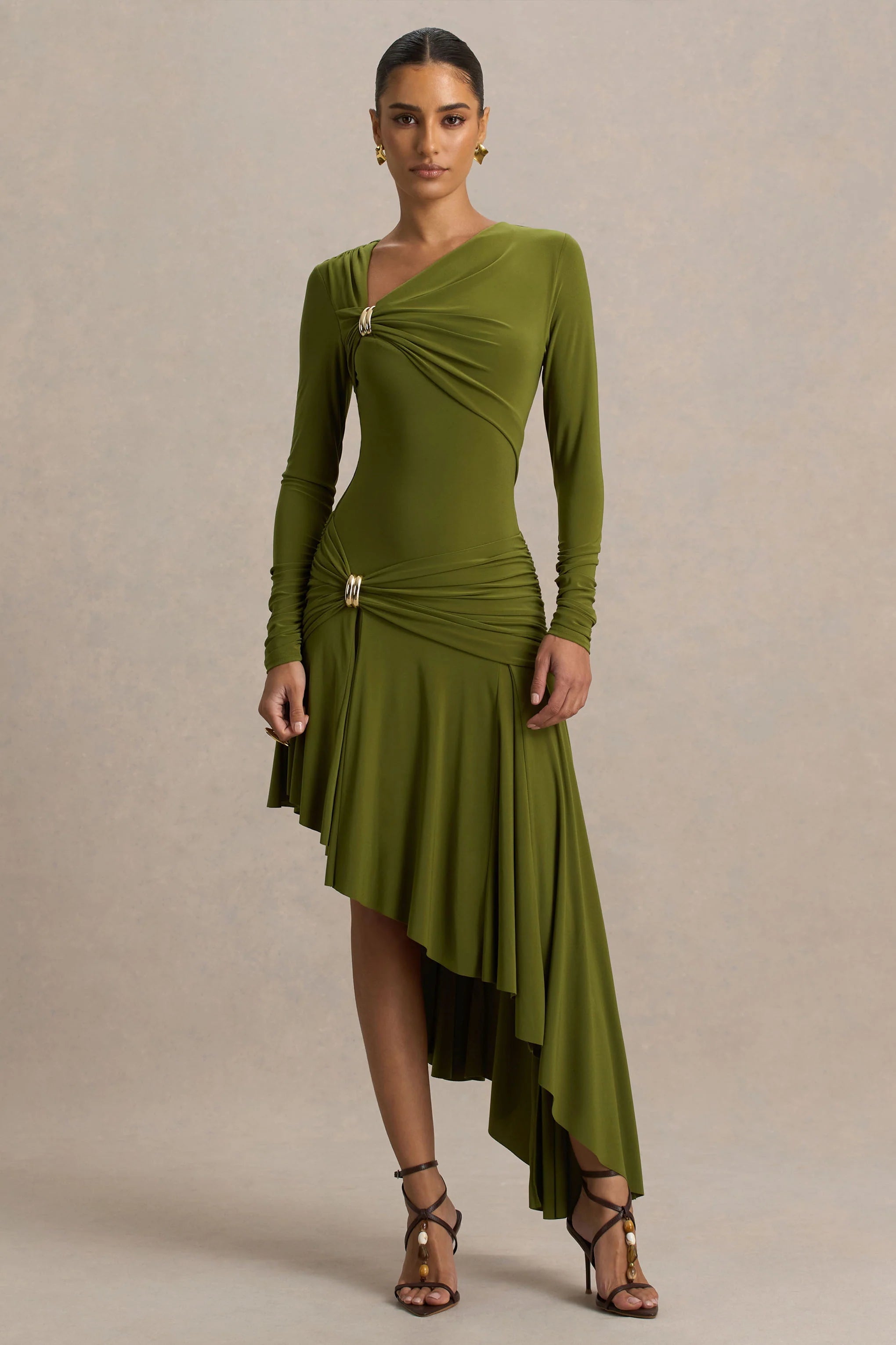 Make a bold impression with Alexia, a striking midi designed to turn every head. Crafted from our premium stretch jersey in a rich green hue, this silhouette sculpts and smooths with a flawless fit that moves effortlessly with you. An asymmetric neckline and hemline add a modern edge, while gold trim accents bring a touch of luxe to every angle. Complete with long sleeves and ruched detailing that enhances your shape, Alexia is your go-to for contemporary elegance with a statement twist.