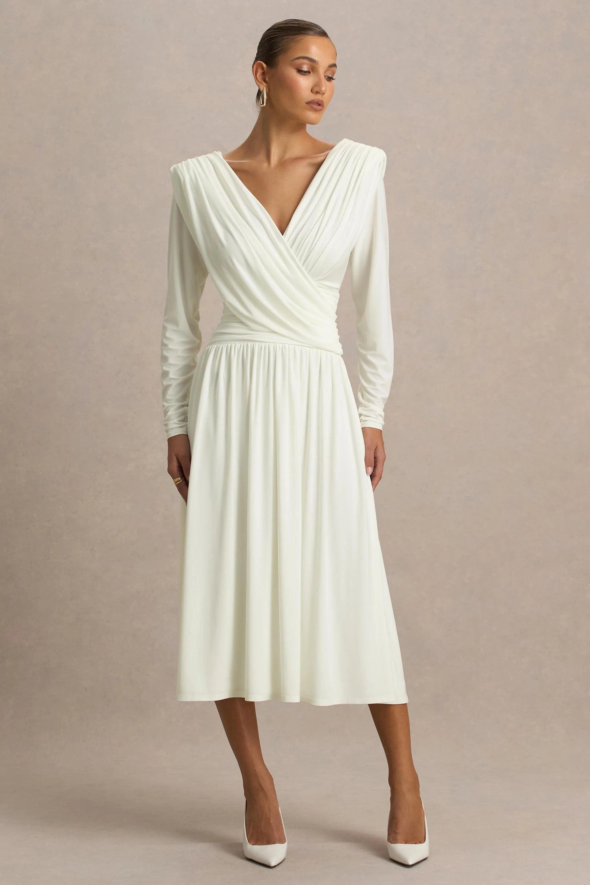 Turn heads with Alexis, as striking piece that embodies understated glamour. Cut from our premium cream stretch jersey, this figure-flattering midi silhouette flatters all the right places while offering a striking finish. A plunging neckline and wrapped bodice create a sculpted shape, perfectly balanced by loose-fitting long sleeves for an effortless touch of elegance. With draped detailing that enhances every curve, Alexis is the ultimate dress for elevated evenings and unforgettable moments.