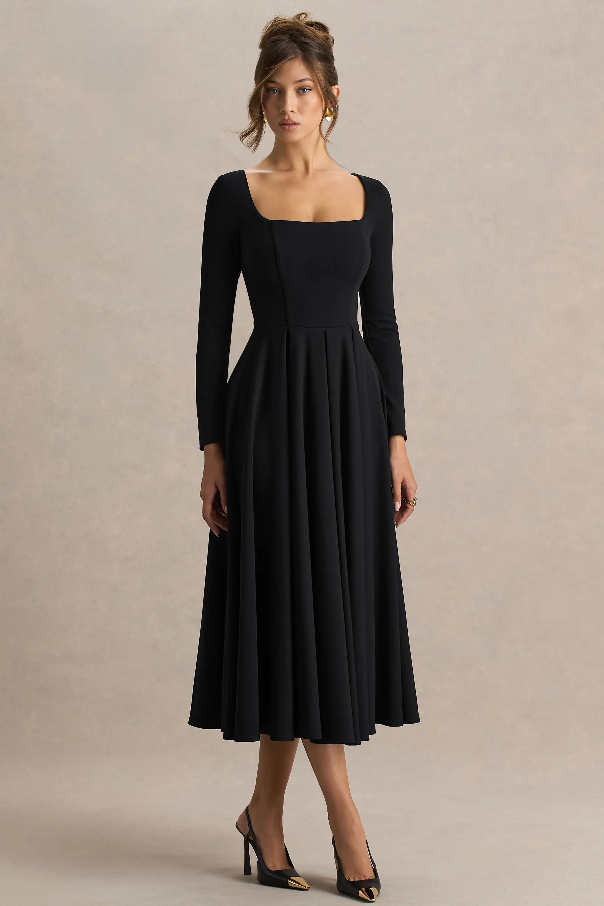 Classic elegance meets modern chic with Alison. Crafted from our premium scuba crepe, this rich black midi dress is designed to sculpt and smooth while offering a polished silhouette. The structured square neckline and long sleeves create a timeless, tailored feel, while the softly pleated skirt adds graceful movement with every step. Perfect for elevated occasions or sophisticated evenings, Alison is a true wardrobe staple.