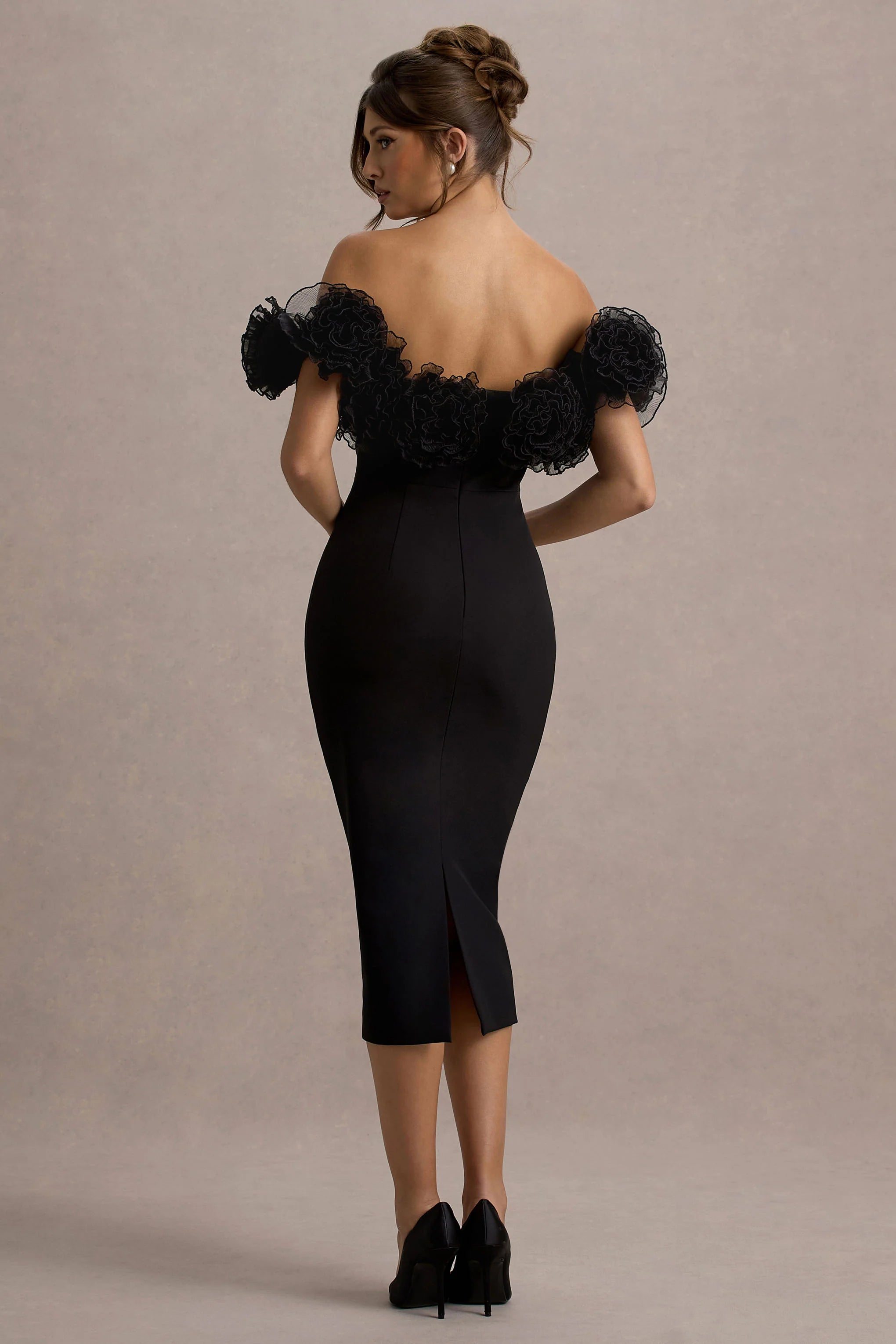 Introducing the flirty and feminine, Alizzi midi. Crafted in our premium stretch crepe in black, and finished with a striking contrast of white rosette detailing. The femininity of the bandeau neckline covered in roses, adds a touch of glamour like no other. Alizzi is perfect for date nights or any evening occasion with some simple accessories.