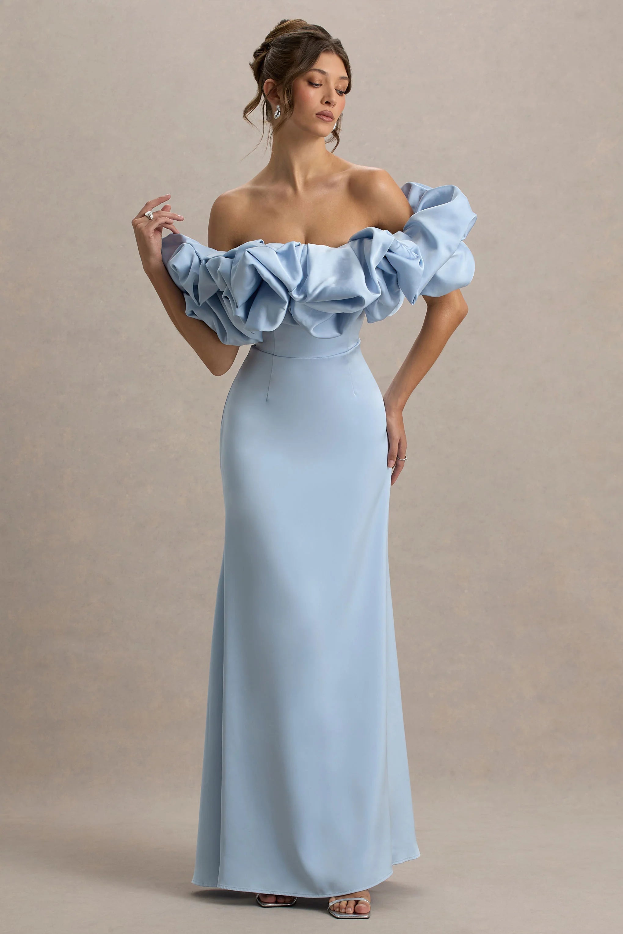 Exude romantic elegance in our latest gown, Allie. Cut in a soft powder blue shade of our premium stretch satin, this detailed maxi is one you won't be forgotten in. The ruffled bardot neckline, that seamlessly blends into statement puff sleeves, gives this piece a sultry edge that gracefully highlights your decolletage. In Allie you will make an entrance at any special occasion. Style this show-stopper with sparkling earrings and be ready to have all eyes on you.