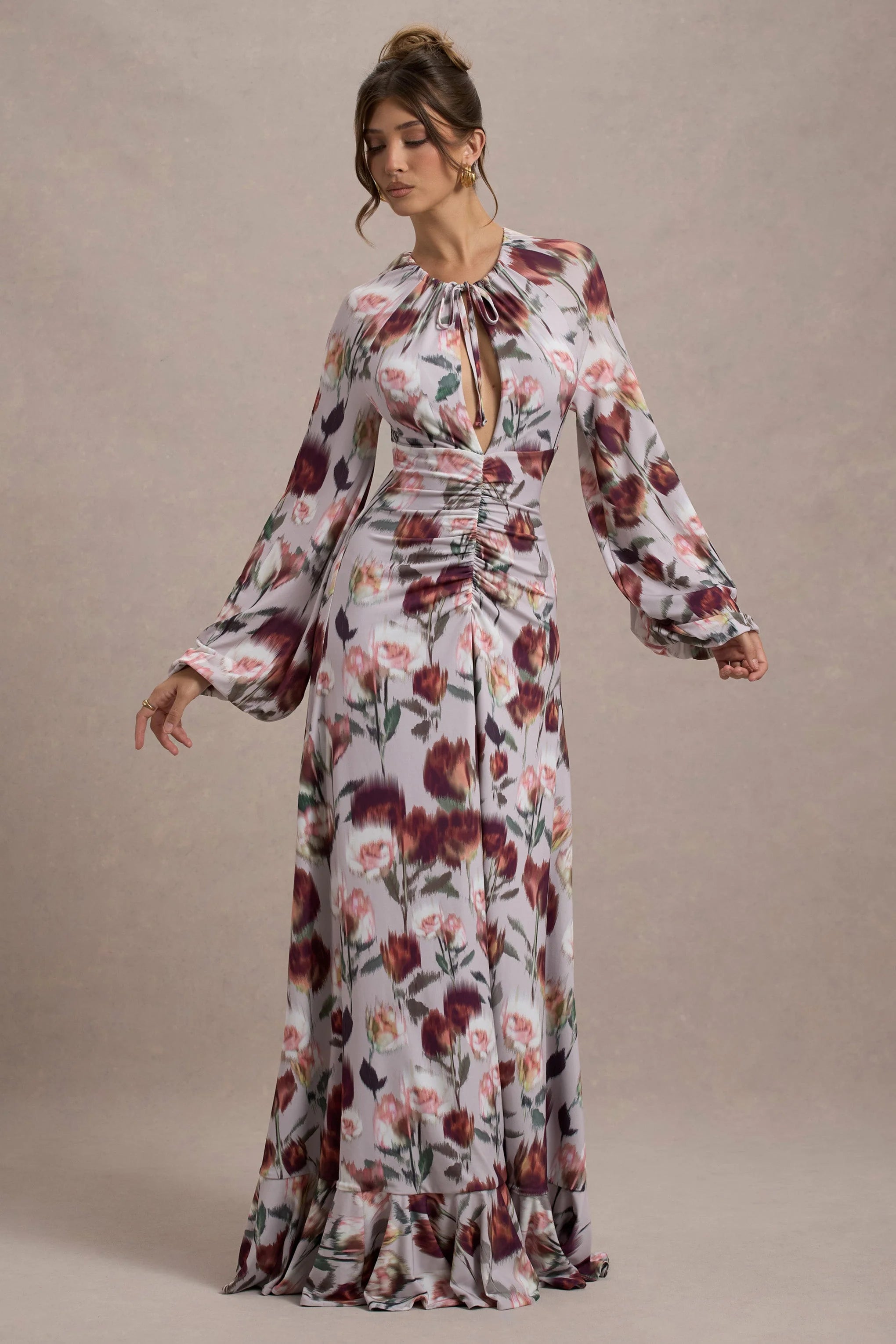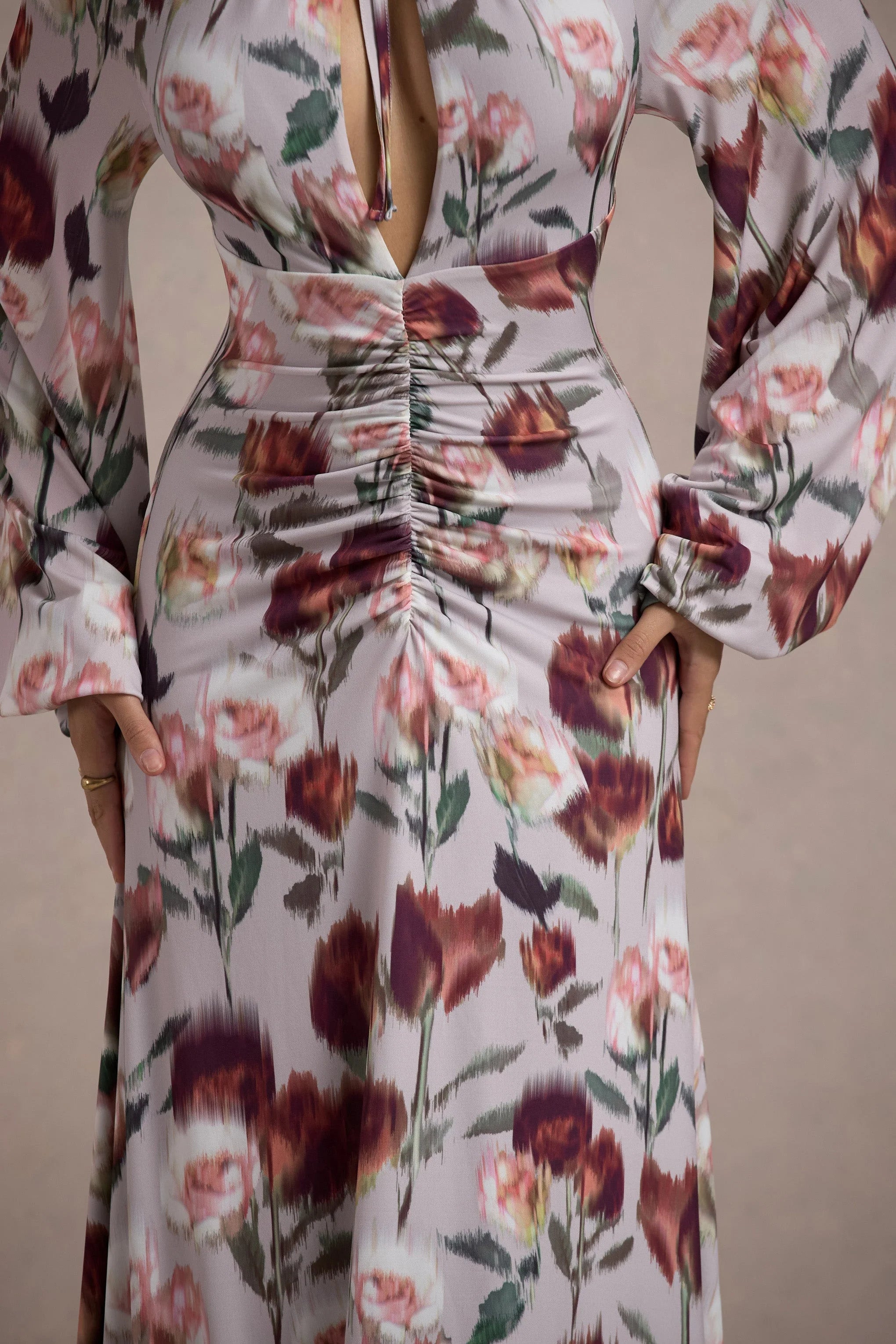 Adorned with soft romantic elements, allure in Althena. Crafted in a cream floral print of a premium solton, this billowy maxi dress is detailed by a self-tie neckline, blouson sleeves and contemporary keyhole cut-out. Complete with waist-cinching ruching, this floor-sweeper is a flattering choice for any special event.