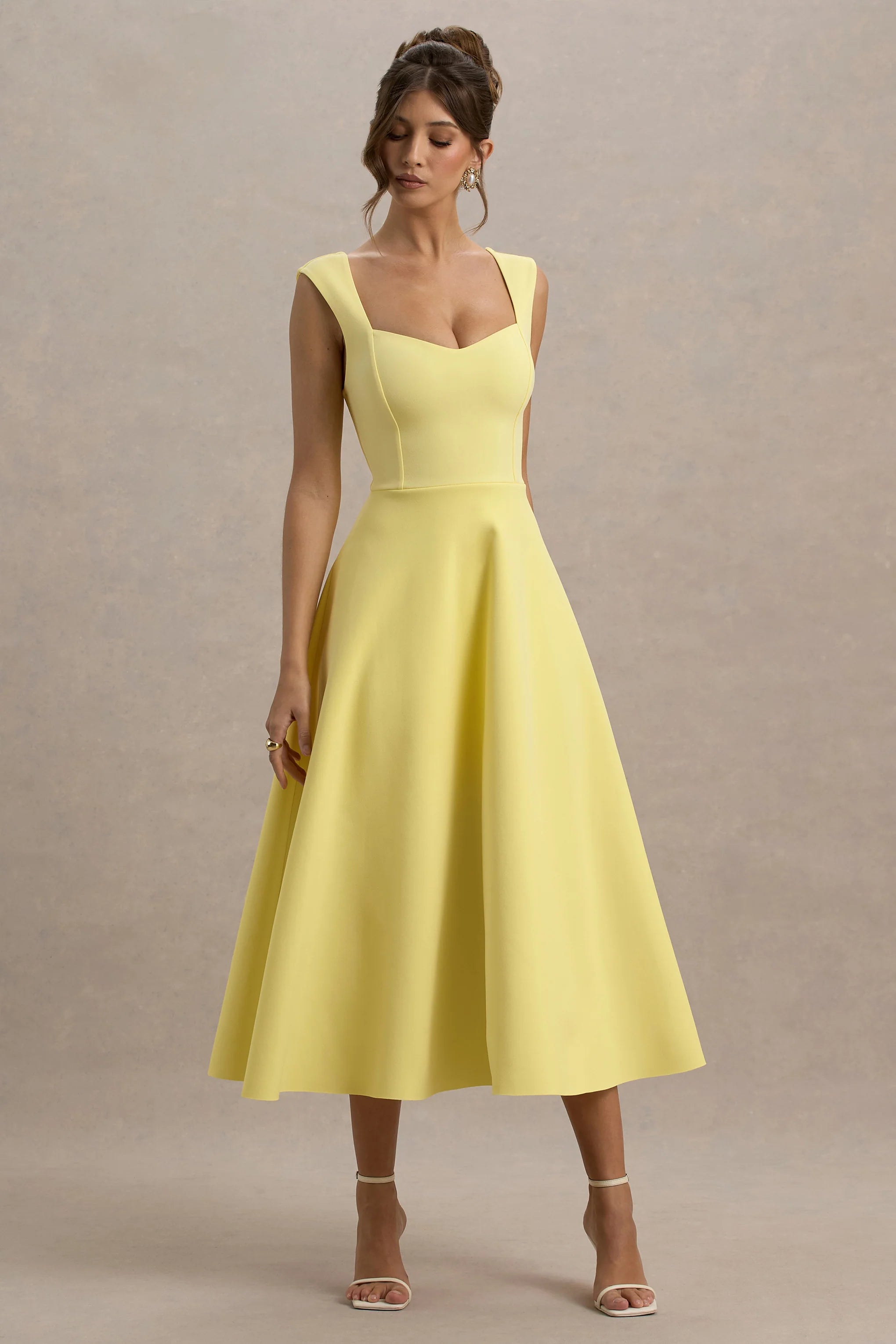 Fun, flirty and breezy, Andromeda will quickly become your go-to this season. Curated in our premium scuba crepe in a dashing lemon hue, this midi showcases a silhouette made to flatter all. The sweetheart neckline transforms beautifully into a voluminous skater skirt, seamlessly creating a romantic look. Pair your Andromeda with statement accents for the perfect ensemble.