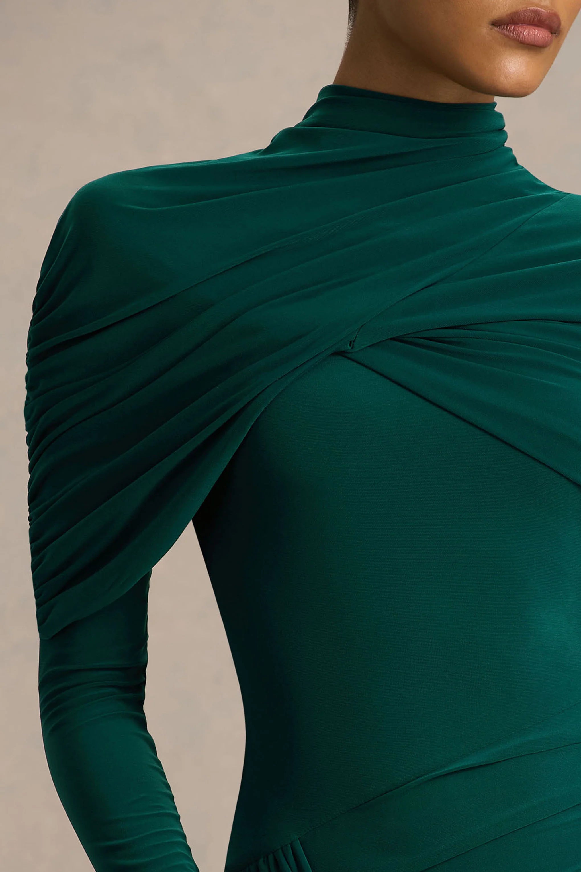 Step into sophistication with Aneira, where elegance meets edge. Cut from our premium bottle green stretch jersey, this sculpting midi dress contours the body beautifully. Featuring a sleek high neckline and dramatic cape sleeves that fasten with a gold button detail, Aneira brings modern femininity to any occasion. The asymmetric hemline adds a contemporary twist, making this a standout style for glamorous moments.