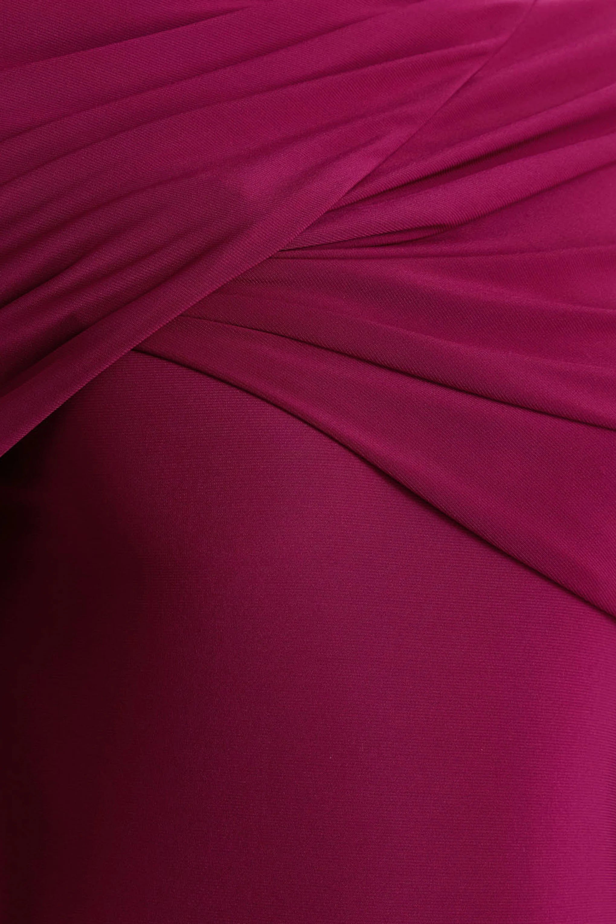 Step into sophistication with Aneira, where elegance meets edge. Cut from our premium burgundy stretch jersey, this sculpting midi dress contours the body beautifully. Featuring a sleek high neckline and dramatic cape sleeves that fasten with a gold button detail, Aneira brings modern femininity to any occasion. The asymmetric hemline adds a contemporary twist, making this a standout style for glamorous moments.