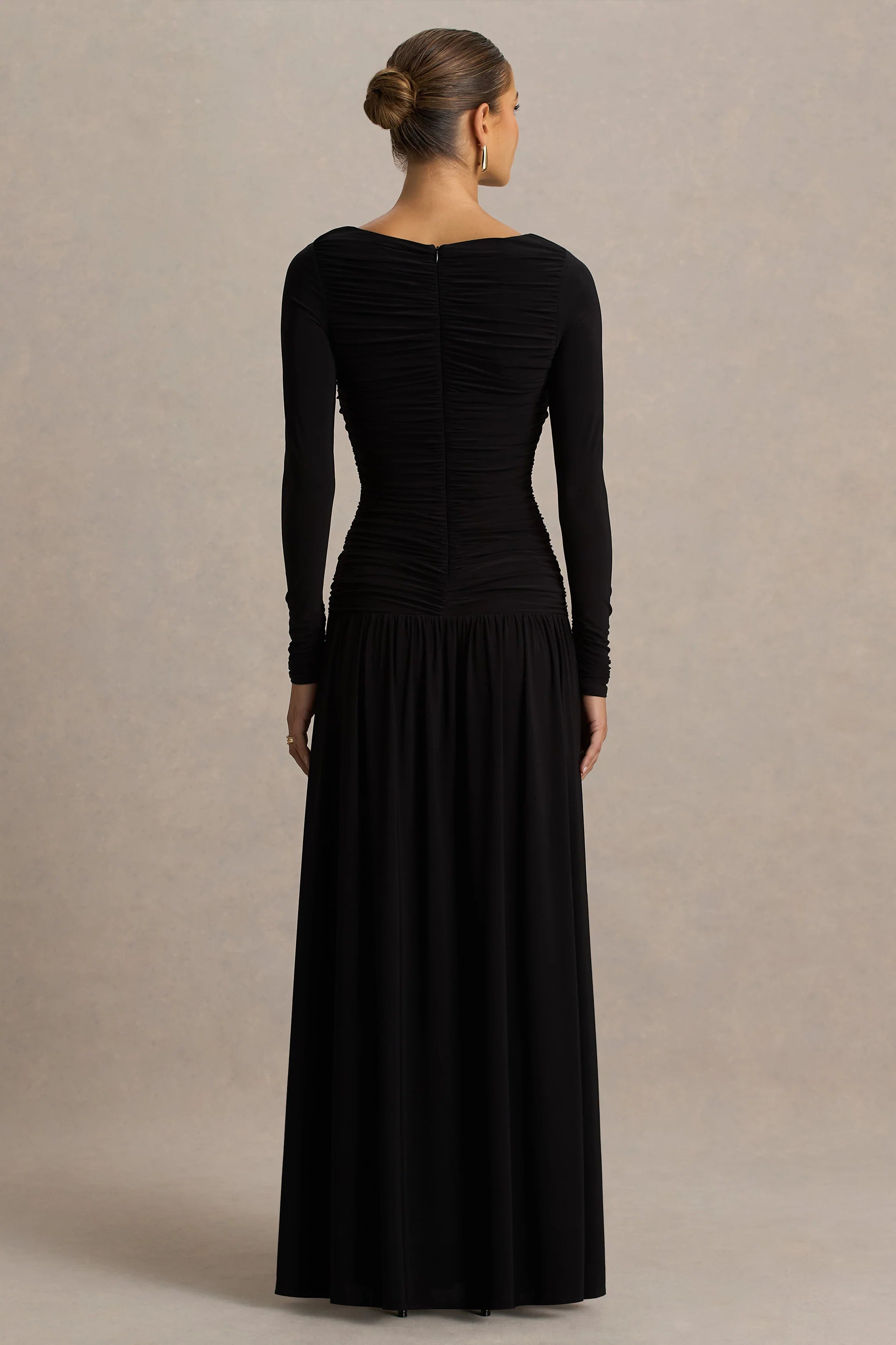 For a look of understated elegance Aniyah is the perfect choice. Curated in a rich black hue of our signature stretch jersey, this dress flatters your figure from every angle. The high neck adds an elegant feel to this gown, while the drop waist and ruched detailing give an effortlessly chic finish. Walk into any occasion in Aniyah and watch all eyes turn on you as the skirt graciously moves with you. Style with a statement earring for a touch of drama.