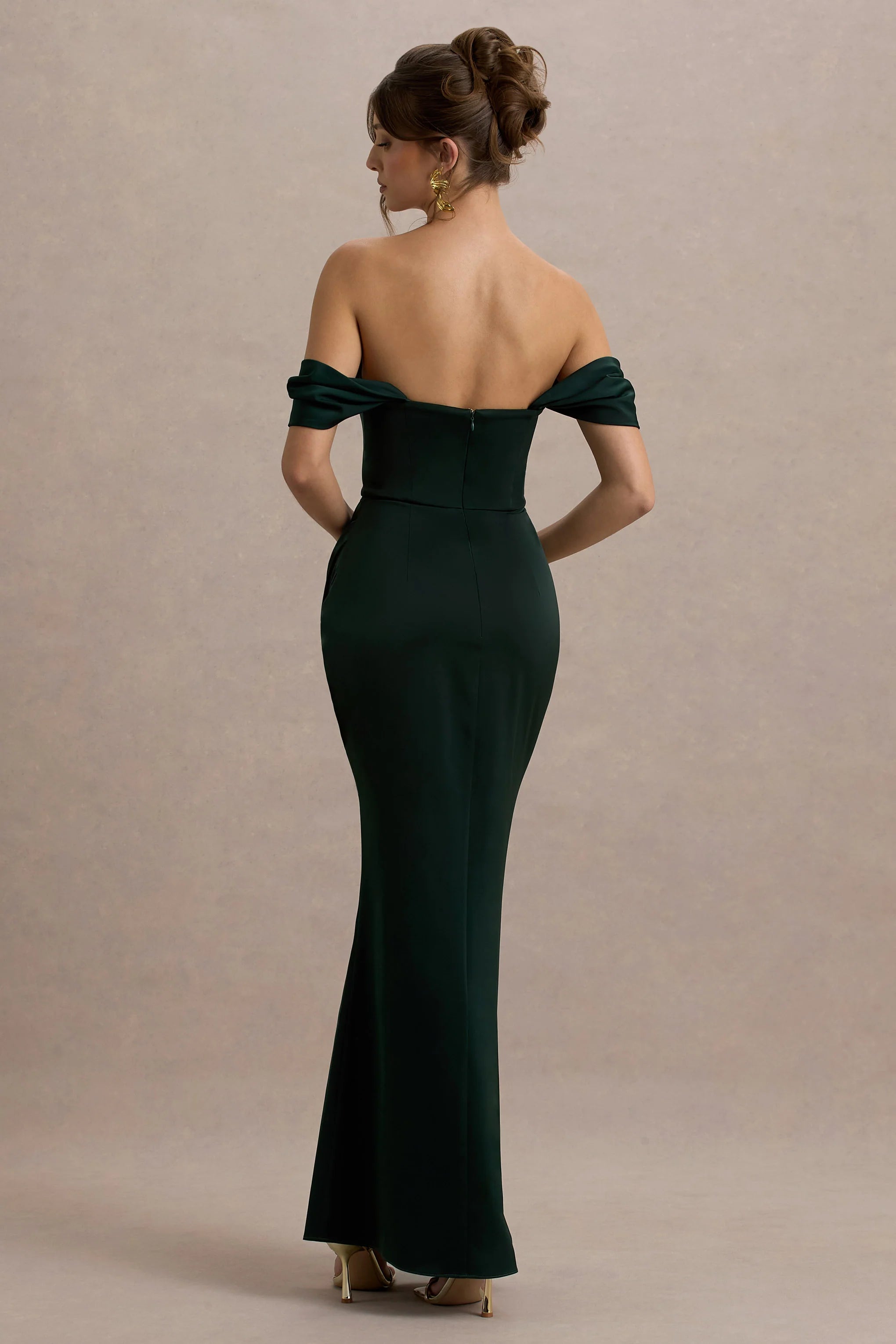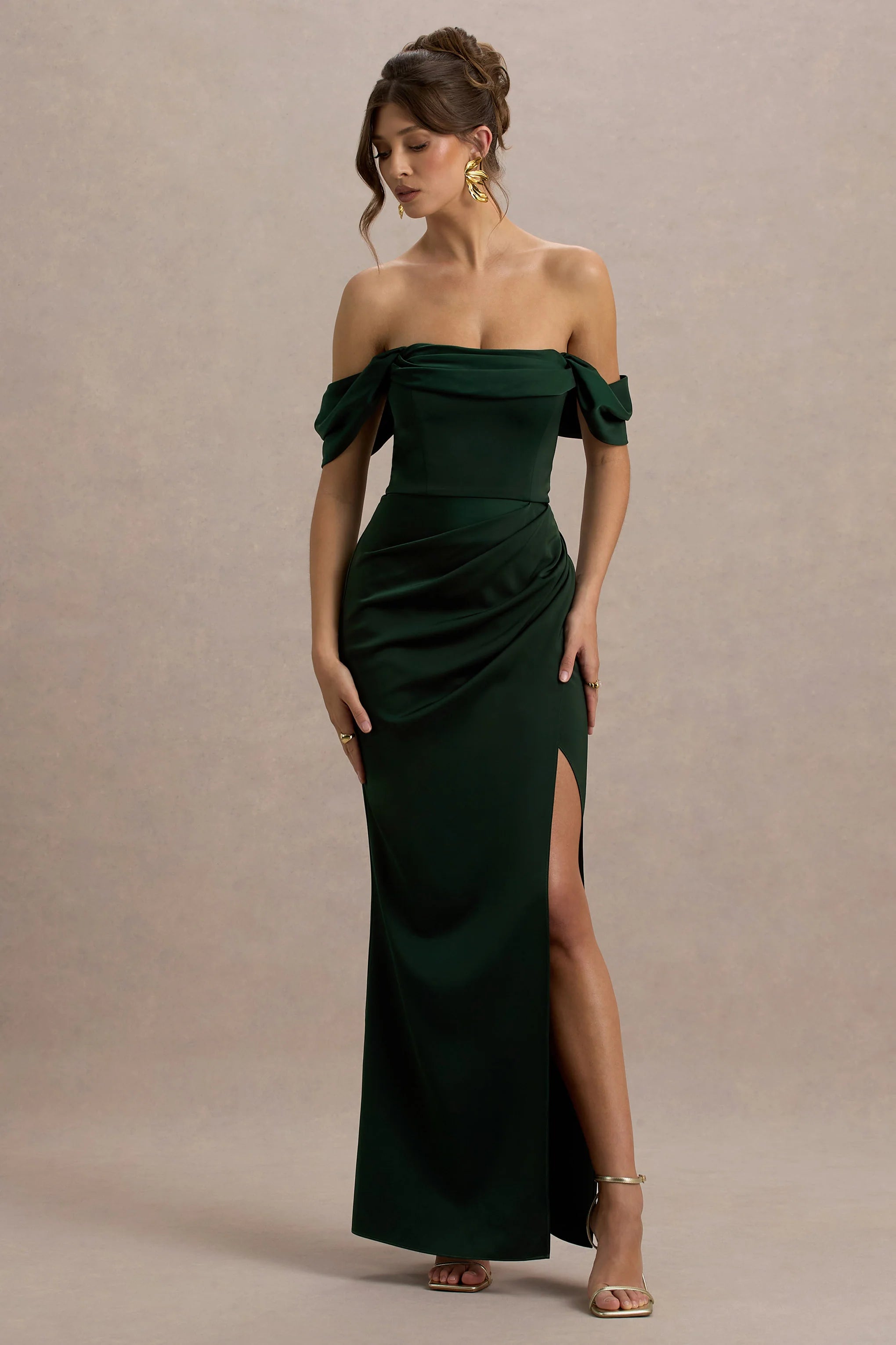 Make an entrance in Annie, a dress that exudes timeless elegance and sophistication. This show-stopping maxi is cut in a bottle green shade of our premium satin that allows this gown to drape beautifully over your curves. The bardot necklines highlights your decolletage, for a feminine finish, while the ruched detailing cinches your waist for a sculpted silhouette. No matter the occasion, in Annie all eyes will be on you. Pair with strappy heels and statement earrings for a look that is utterly breathtaking.