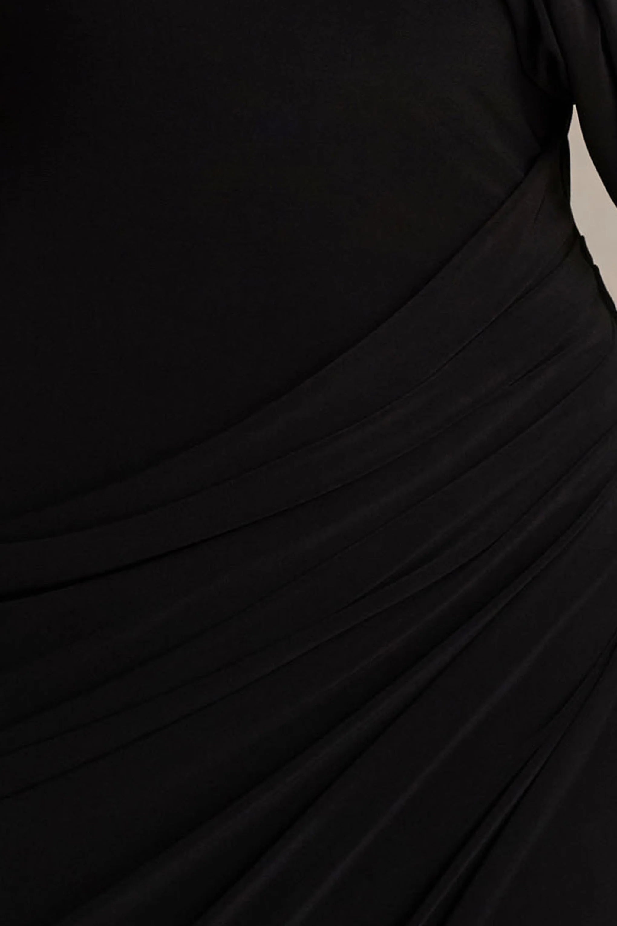 Made for statement-making moments, Aphra is the definition of quiet luxury with a bold twist. Cut in a bold black hue of our premium stretch jersey and flowing to a graceful maxi length, this gown balances chic and sophistication with ease. The high neckline exudes modern edge, while a single cape sleeve adds effortless drama and movement. Finished with draping across the body, Aphra embodies timeless glamour. Style with statement gold earrings to tie the look together.