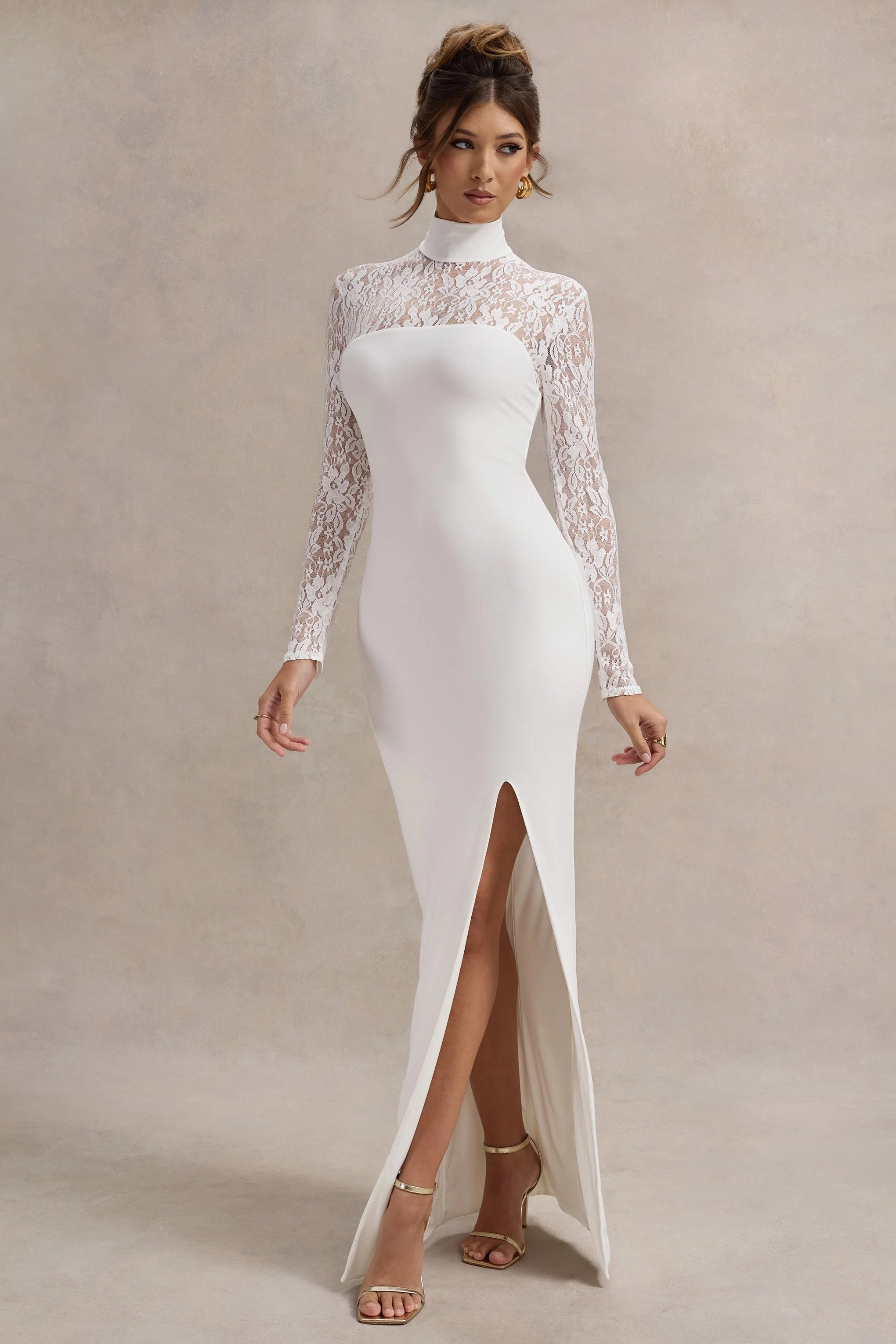 Exuding an ethereal glamour, Arden was made for high impact. Crafted in our signature dual-layered jersey, this white maxi dress boasts long, lace sleeves and a demure high neckline. Finished with a high-leg split, Arden is a stand-out choice.