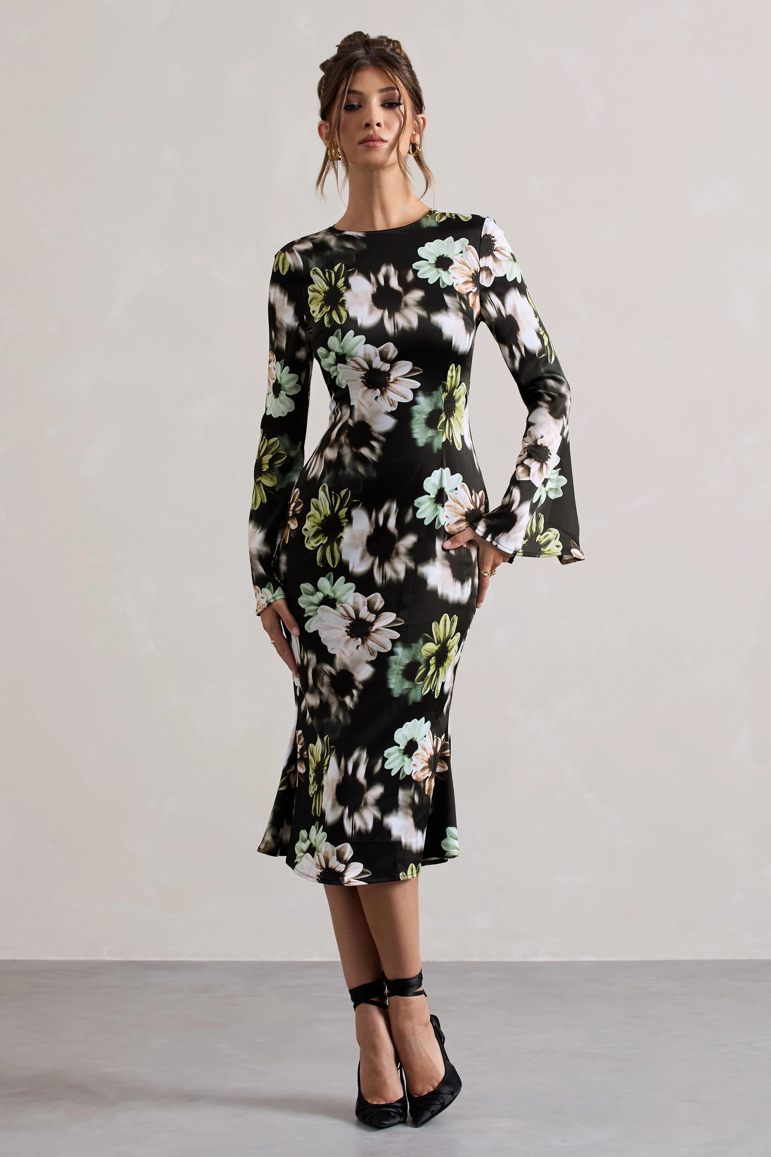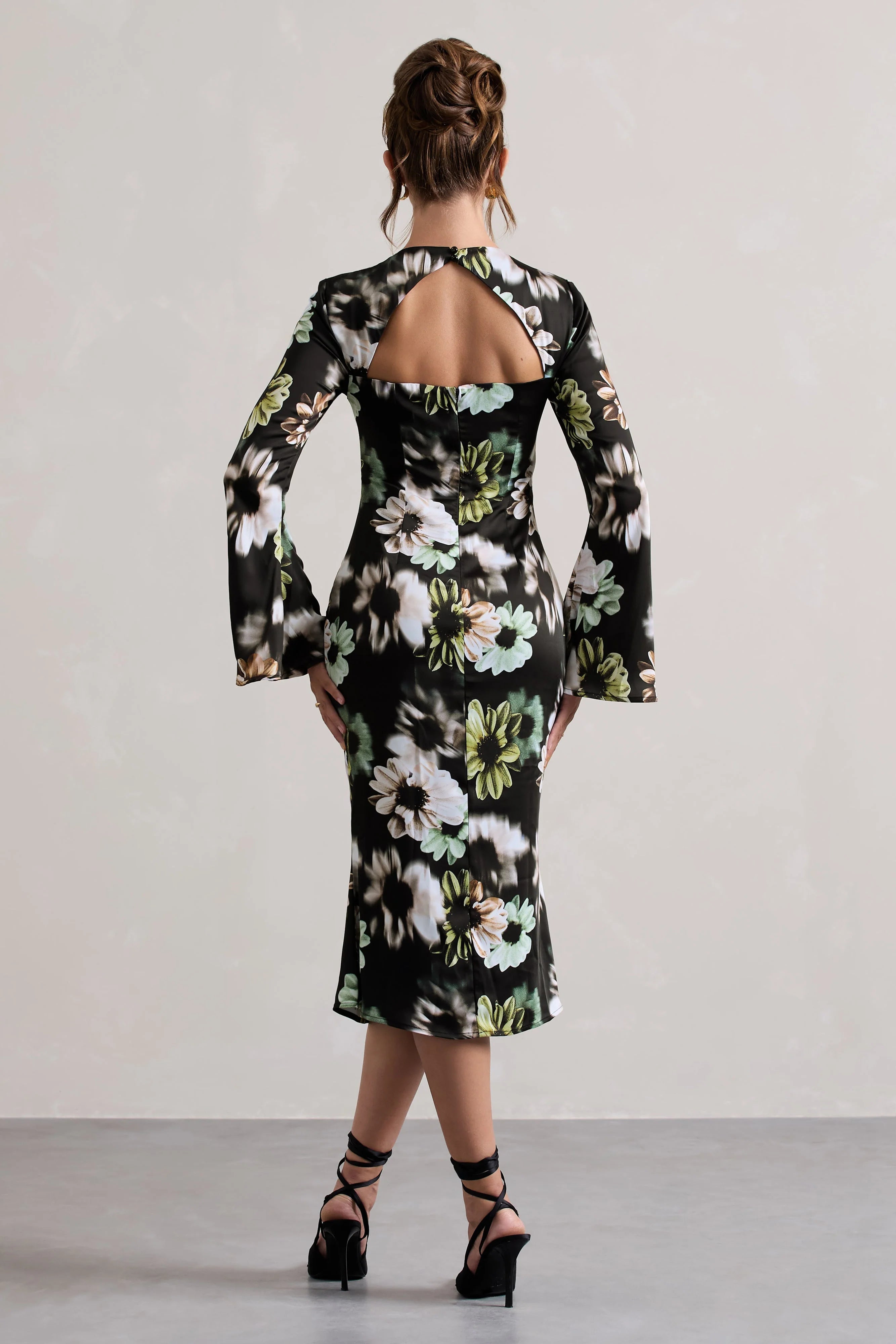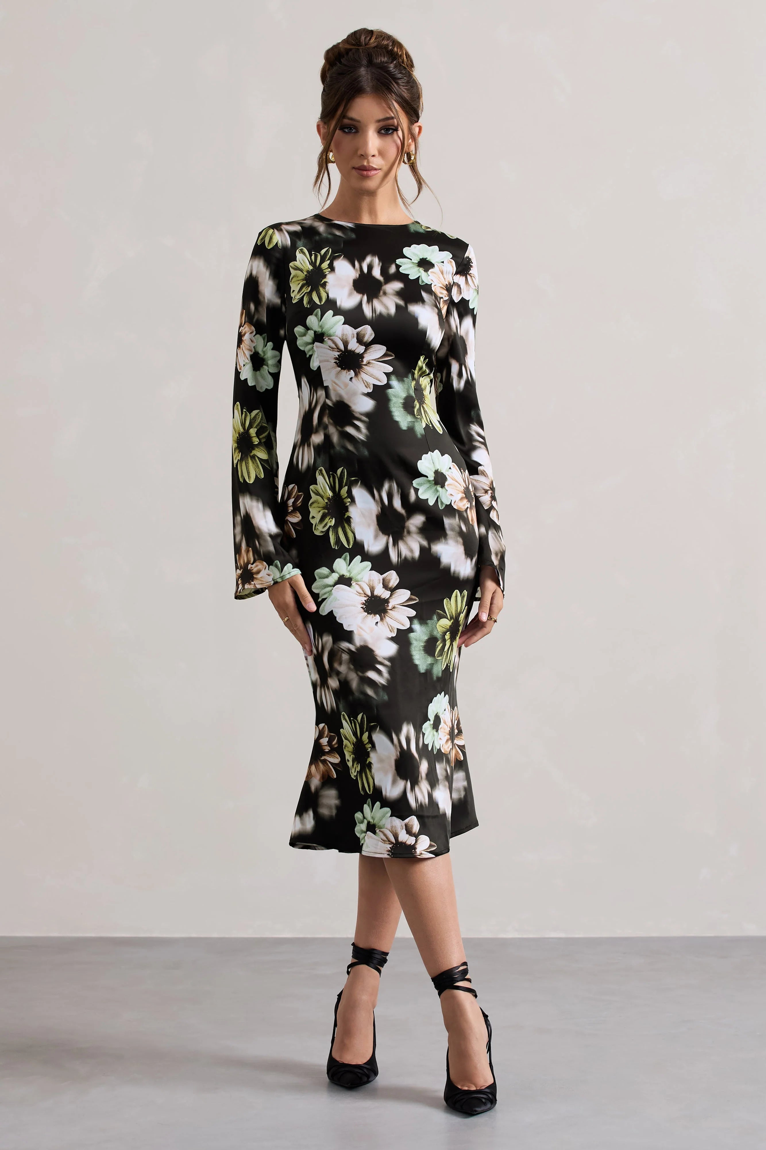 Crafted a bold black floral print, Arlitta is a must-have this summer. Designed in our premium silky satin, this timeless midi dress boasts long flute sleeves and a contemporary cut-out back. For a classic wedding guest ensemble, pair yours with our Sweet Step stilettos and some gold earrings.