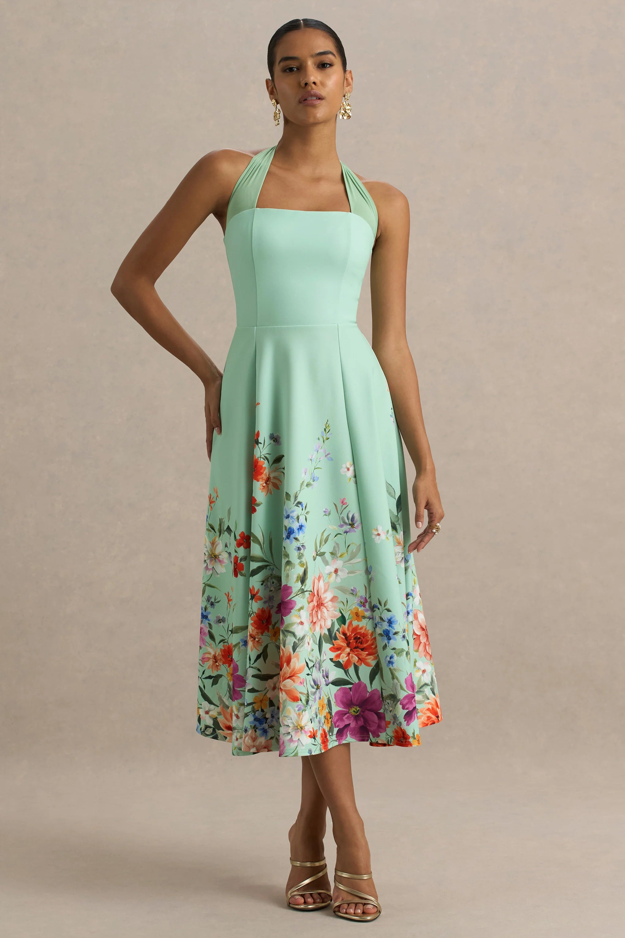 A stand-out staple, every girl needs a dress like Auburn. Expertly crafted in a premium scuba crepe, this mint placement floral print midi dress is detailed by a self-tie mesh halter and ethereal skater skirt.