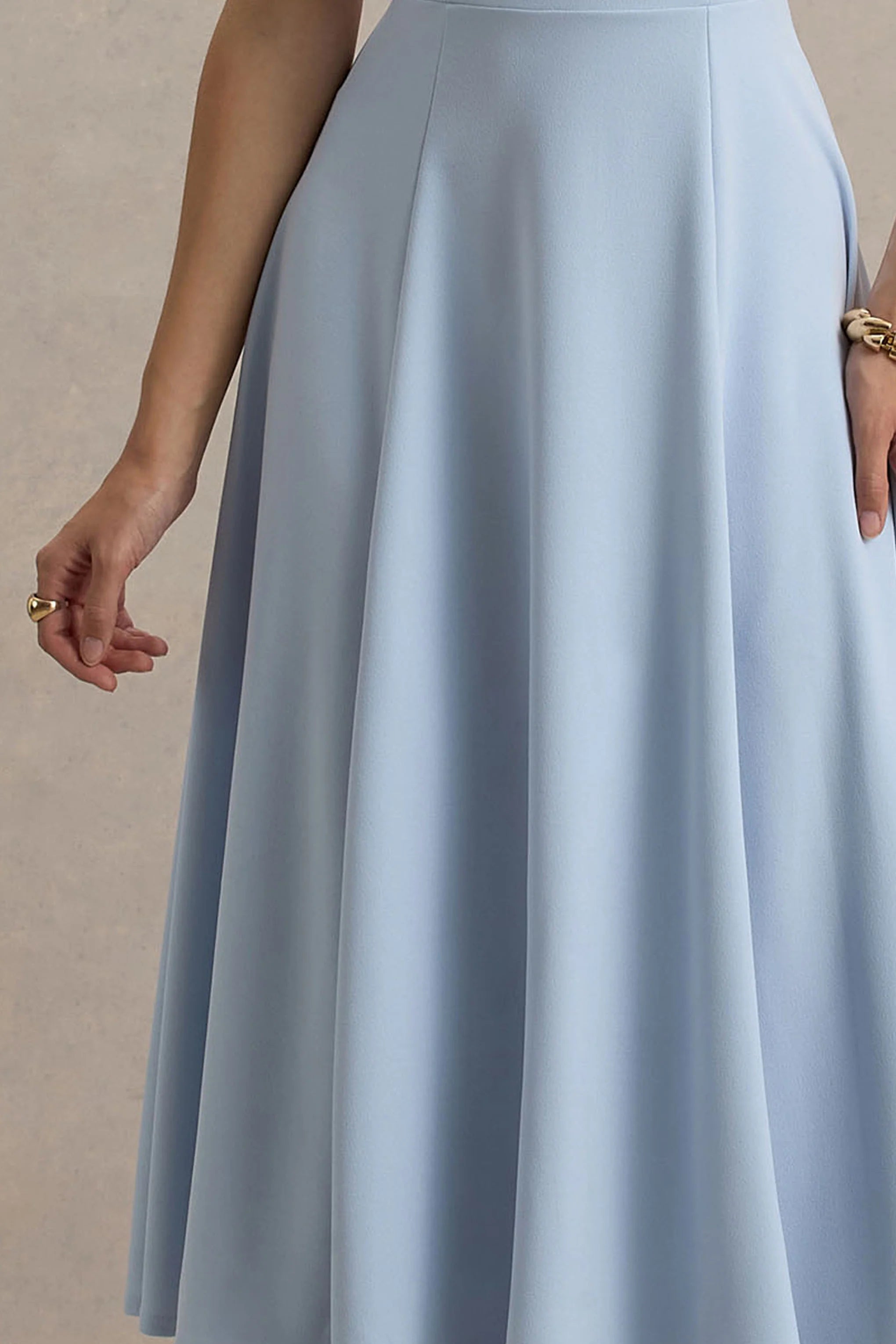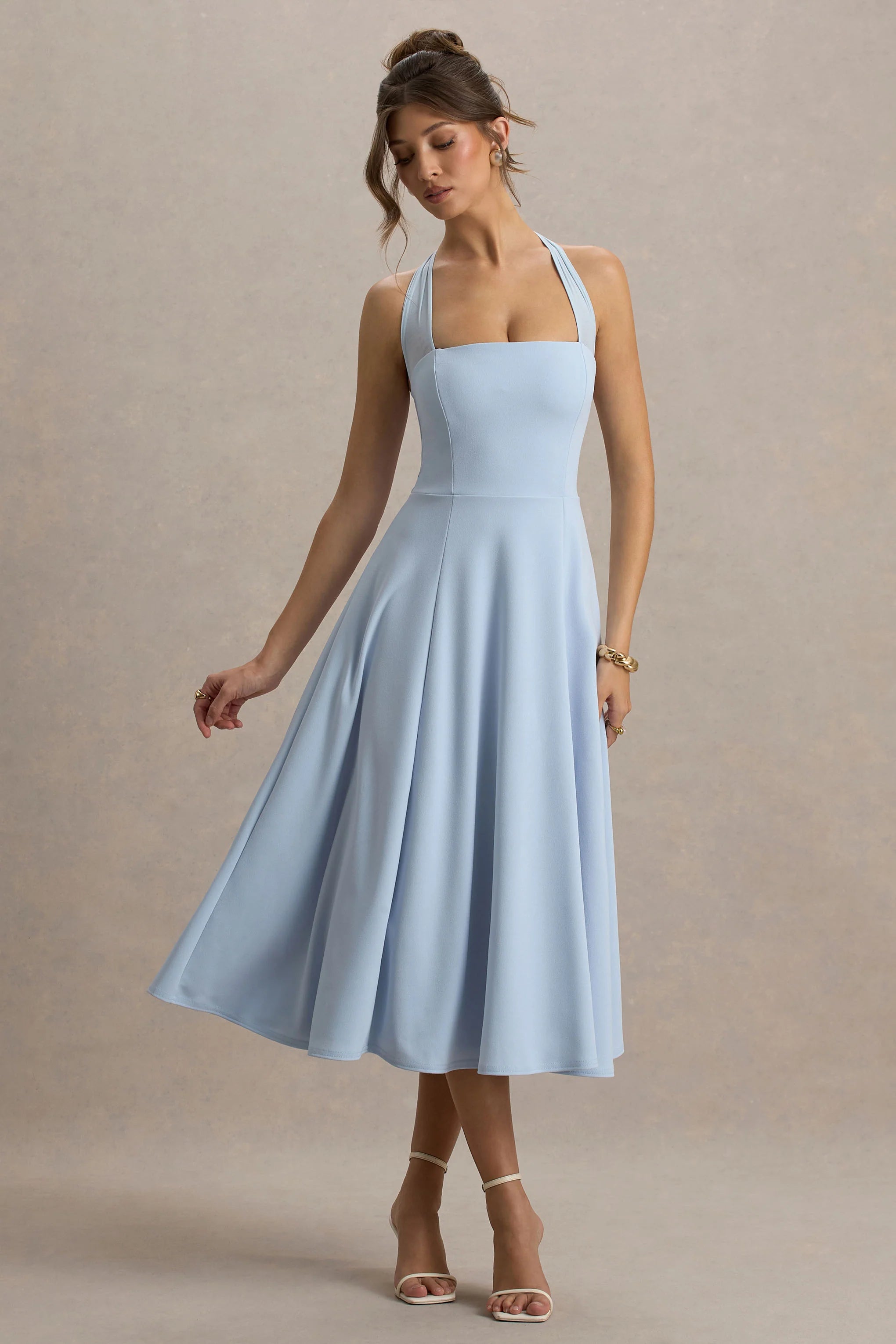 A stand-out staple, every girl needs a dress like Auburn. Expertly crafted in a premium scuba crepe, this powder blue midi dress is detailed by a self-tie mesh halter and ethereal skater skirt.