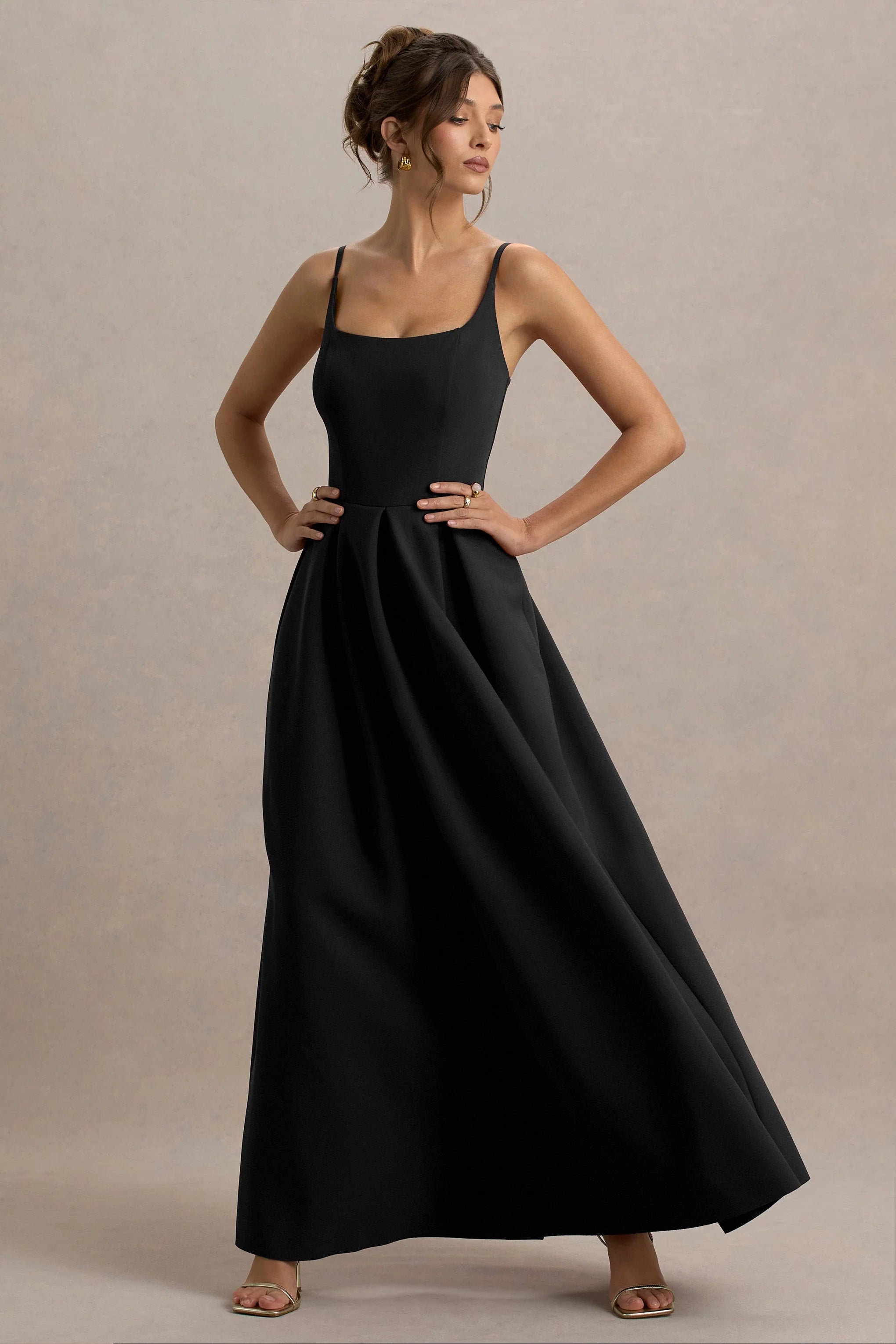 Exude elegance at any upscale event in our chic Bambina maxi. Curated in our premium scuba crepe, in a striking black hue, this dress embodies elegance and timelessness. Finished with a feminine scoop neckline, highlighting your decolletage, as well as a detailed pleated skirt for the ultimate luxury finish. This piece pairs perfectly with strappy heels and glitz accessories, for all VIP moments.