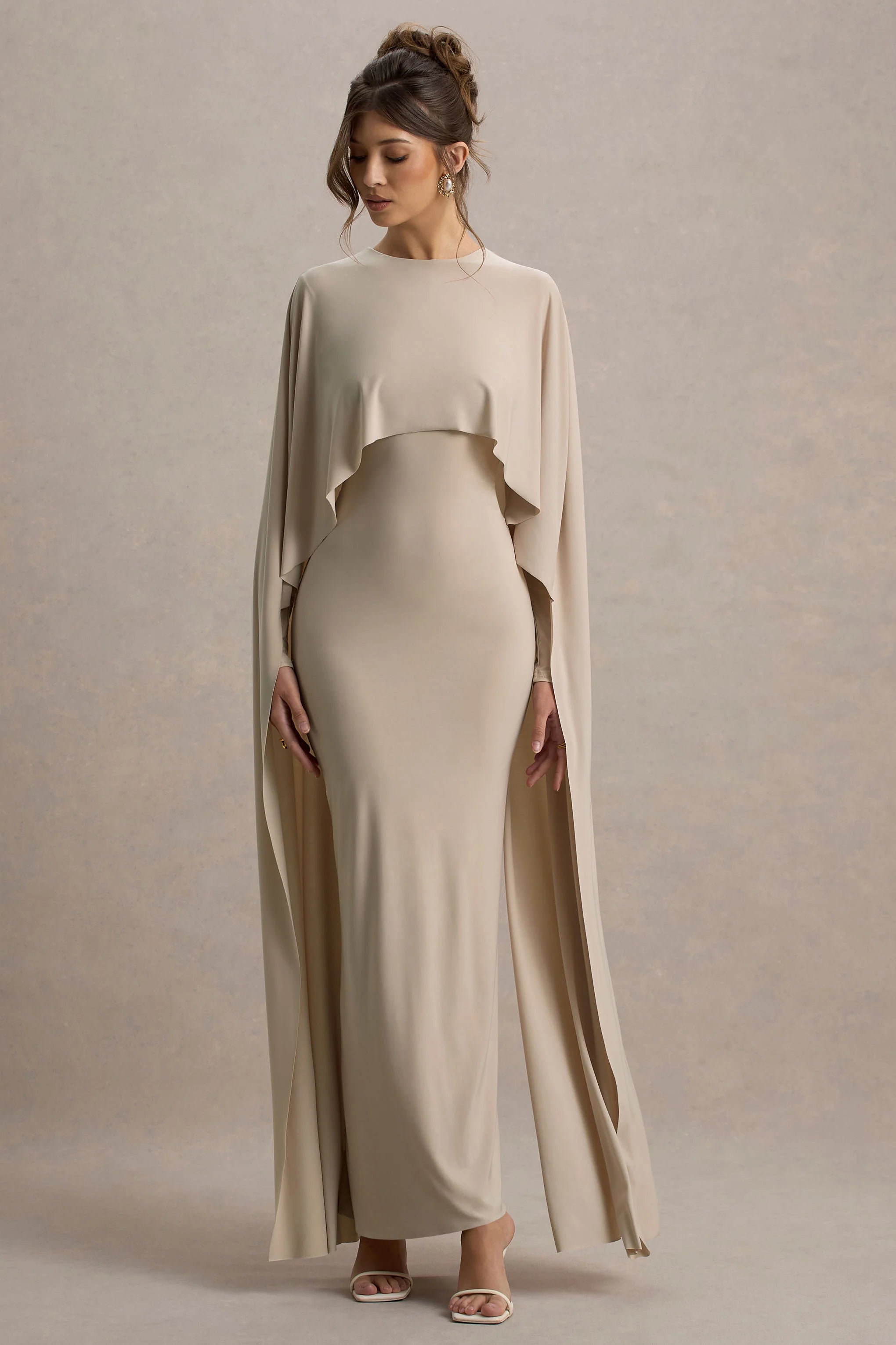 A magical blend of sophistication and elegance, Belinda, has just landed. Featuring cascading cape sleeves, this champagne premium jersey maxi is the perfect choice for any formal affair. Dress up your Belinda with a sleek pair of stilettos and a chic clutch for a head-turning look.