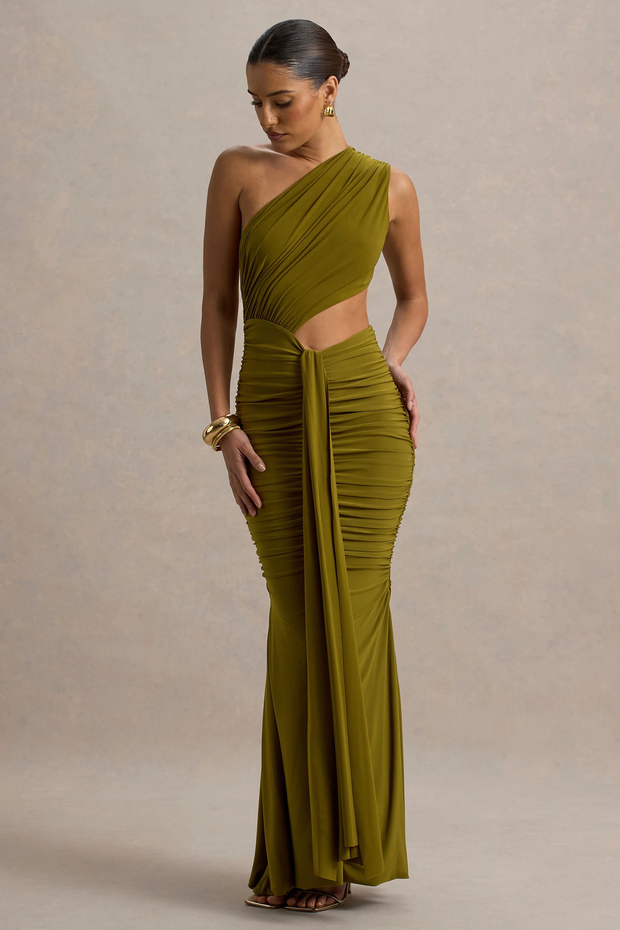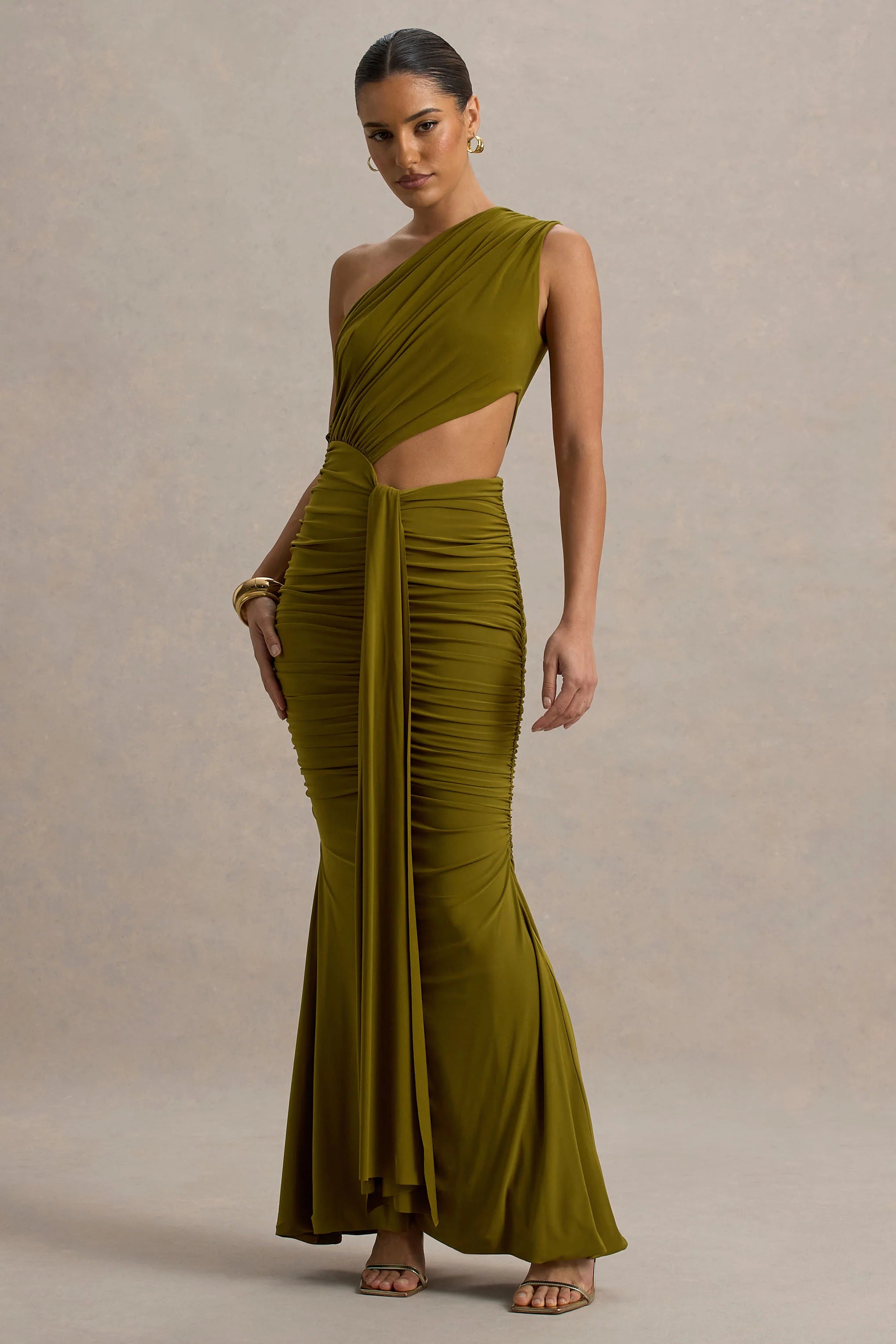 Made for the city nights and everything that follows, add Beline to your wardrobe refresh this season and steal the show whatever the occasion. Crafted from a premium dark green stretch jersey, that's adorned with draped details for a sculpted fit, all eyes will be on you this month thanks to our trending contemporary cut-outs and ruched skirt fit.