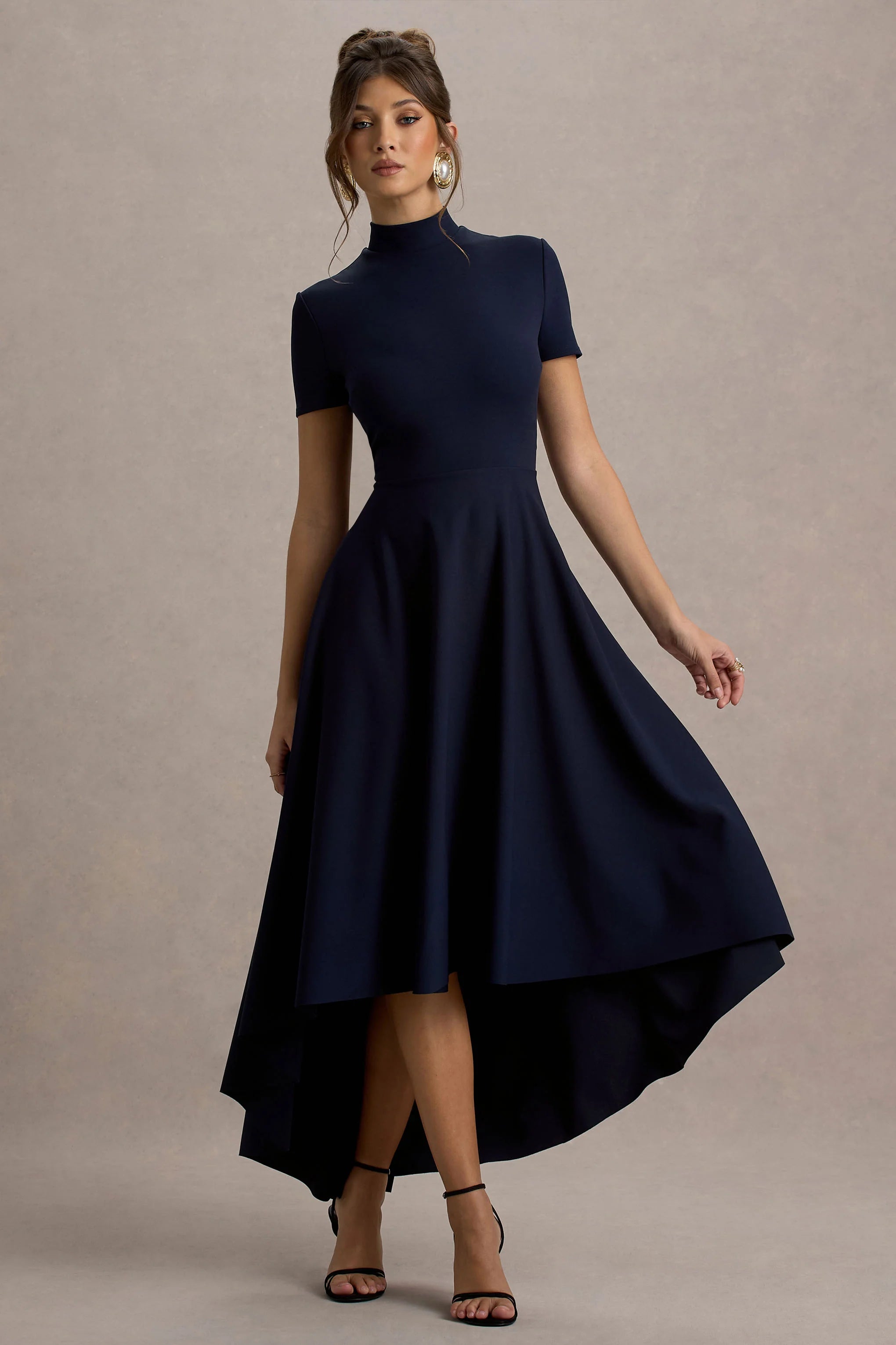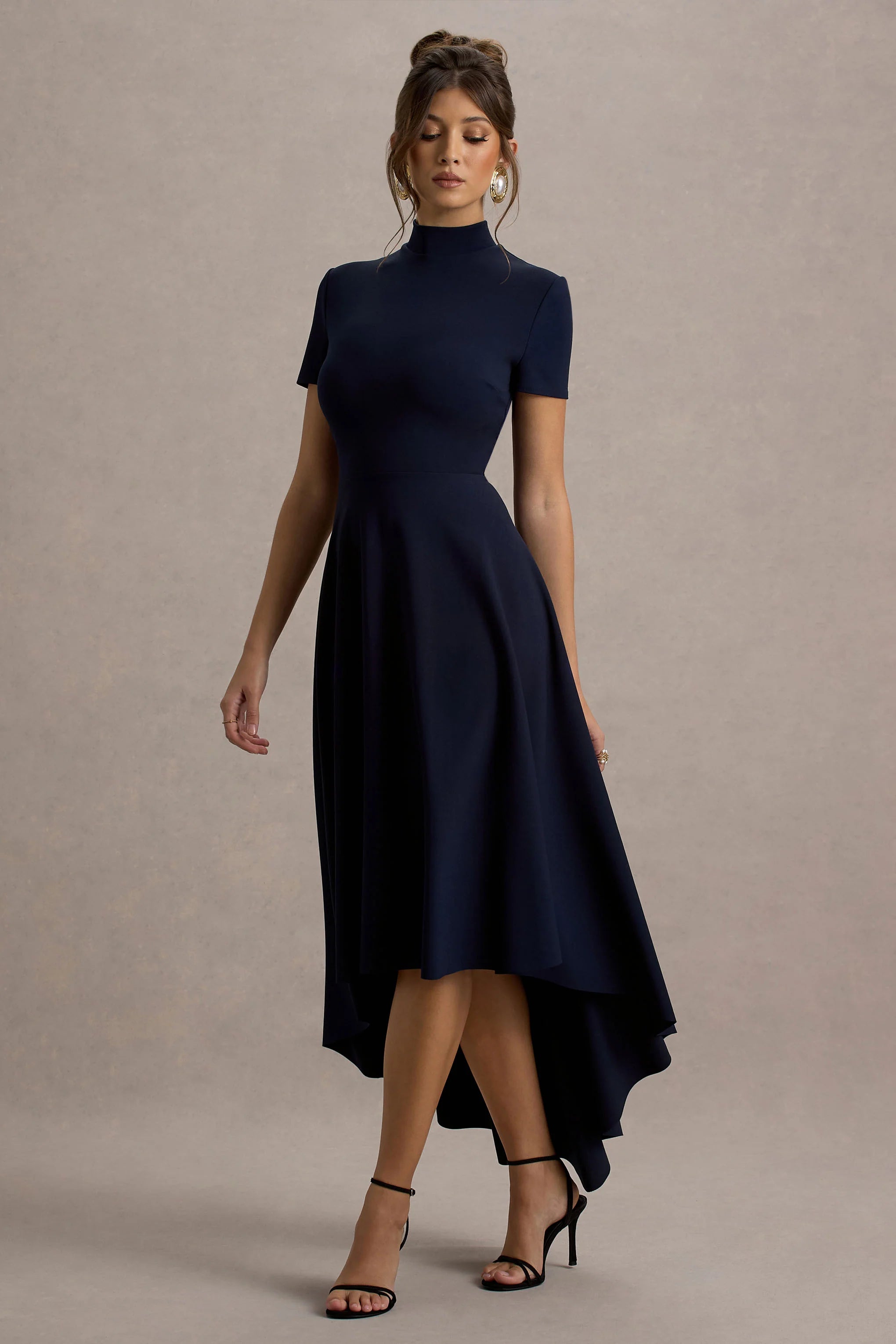 Defined by contemporary elegance and striking details, Bellona is a standout choice for your next special occasion. Crafted from our premium scuba crepe in a rich navy hue, this midi dress features a refined high neckline that exudes sophistication. The fitted bodice flows into a dramatic high-low hem, creating a dynamic silhouette that commands attention. Pair Bellona with a bold clutch for a look that perfectly balances modern style and timeless grace.