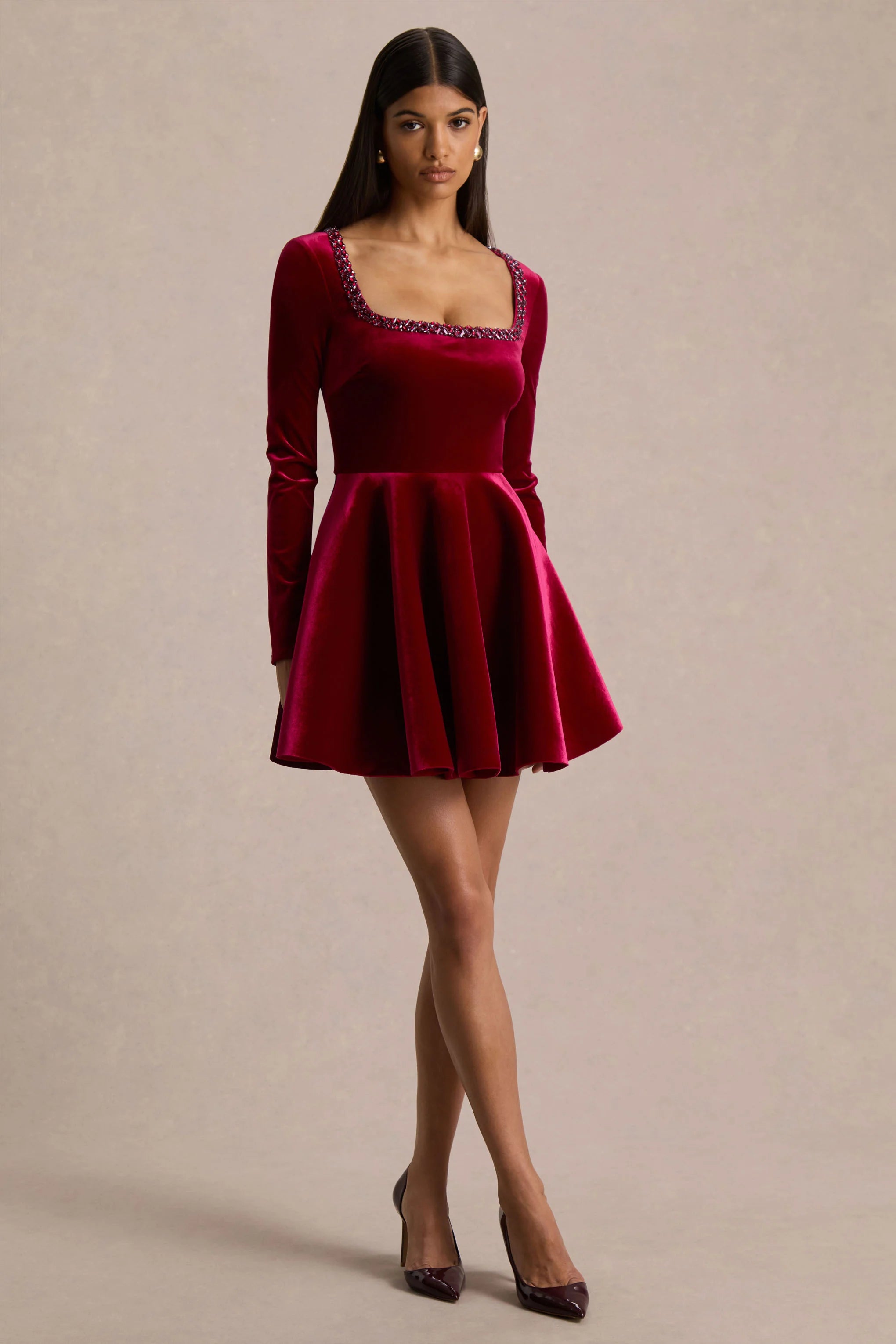Playful yet elegant, Beloved is here to make an entrance. Cut in a rich burgundy hue of our premium velvet, this mini dress is the perfect statement piece for party season. The square neckline features hand-embellished detailing that catches the light gorgeously, whilst framing the decolletage. Finished with a skater skirt that moves beautifully with every gesture, in Beloved you will captivate any room you walk in.