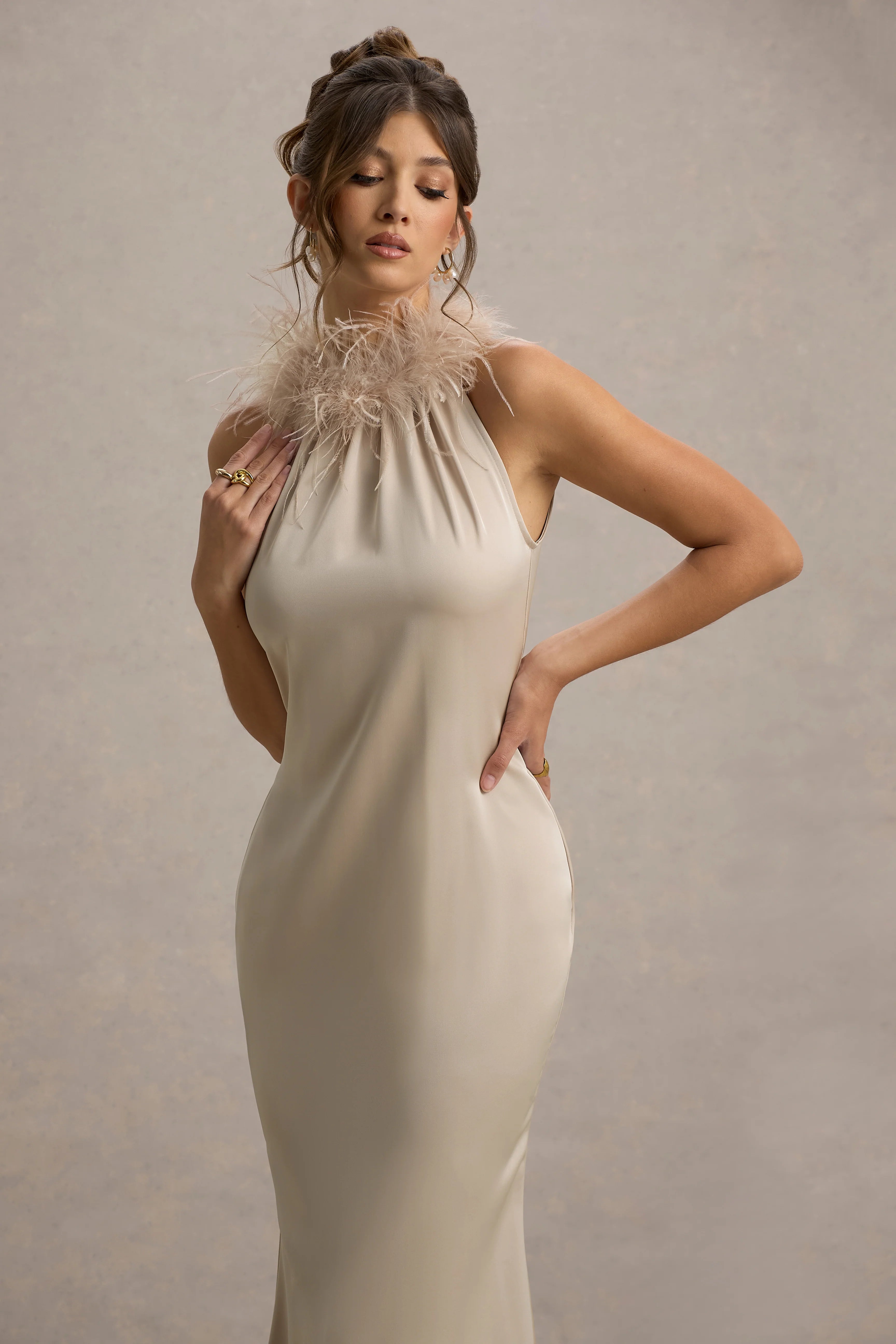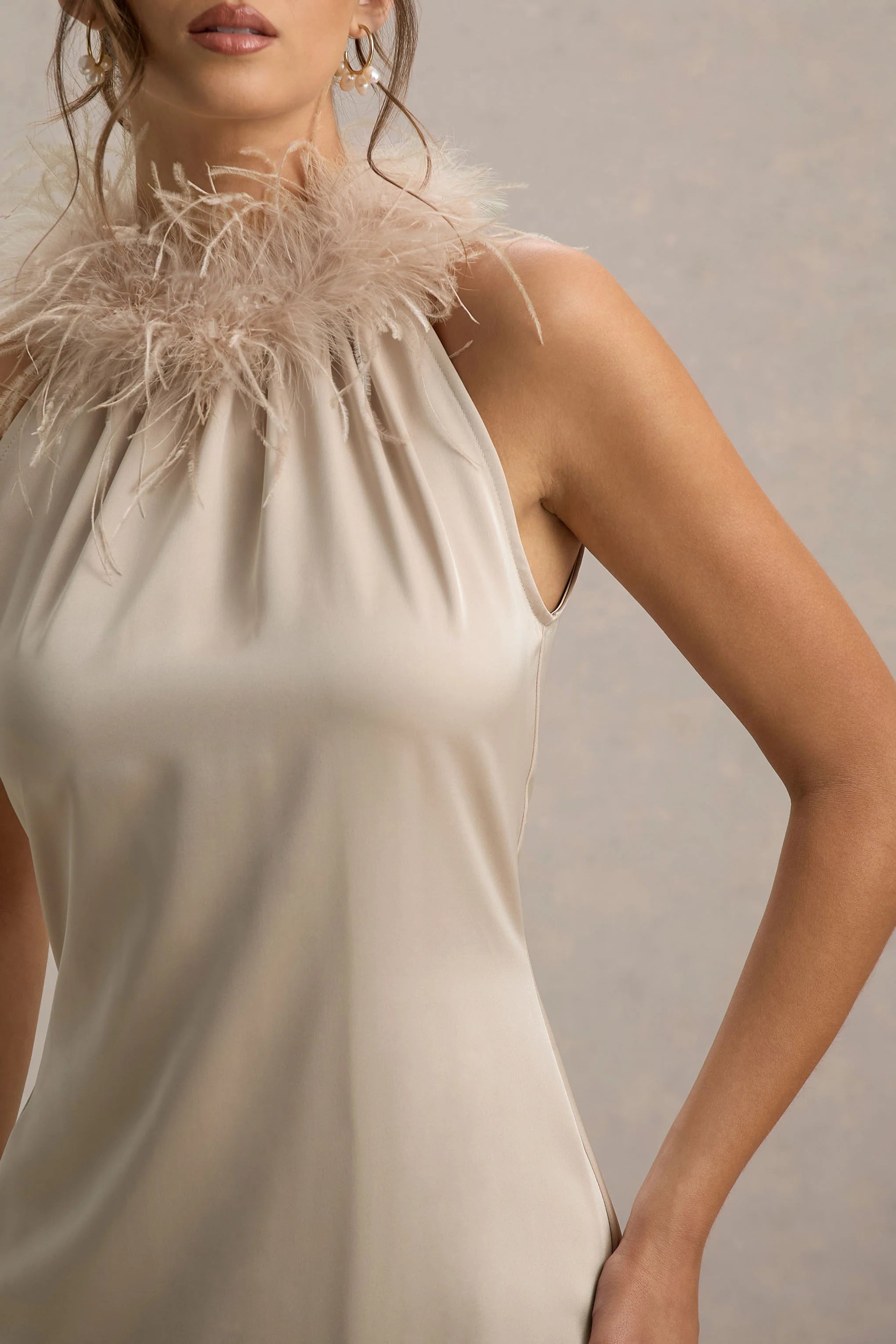 Our gorgeous new maxi, Bianca, is the perfect fit for a timeless occasion wardrobe. Crafted in our premium champagne stretch satin, this backless piece features an alluring feather trim halter neckline and a smooth, flattering silhouette. Perfect for any formal affair, from weddings to dinner parties.