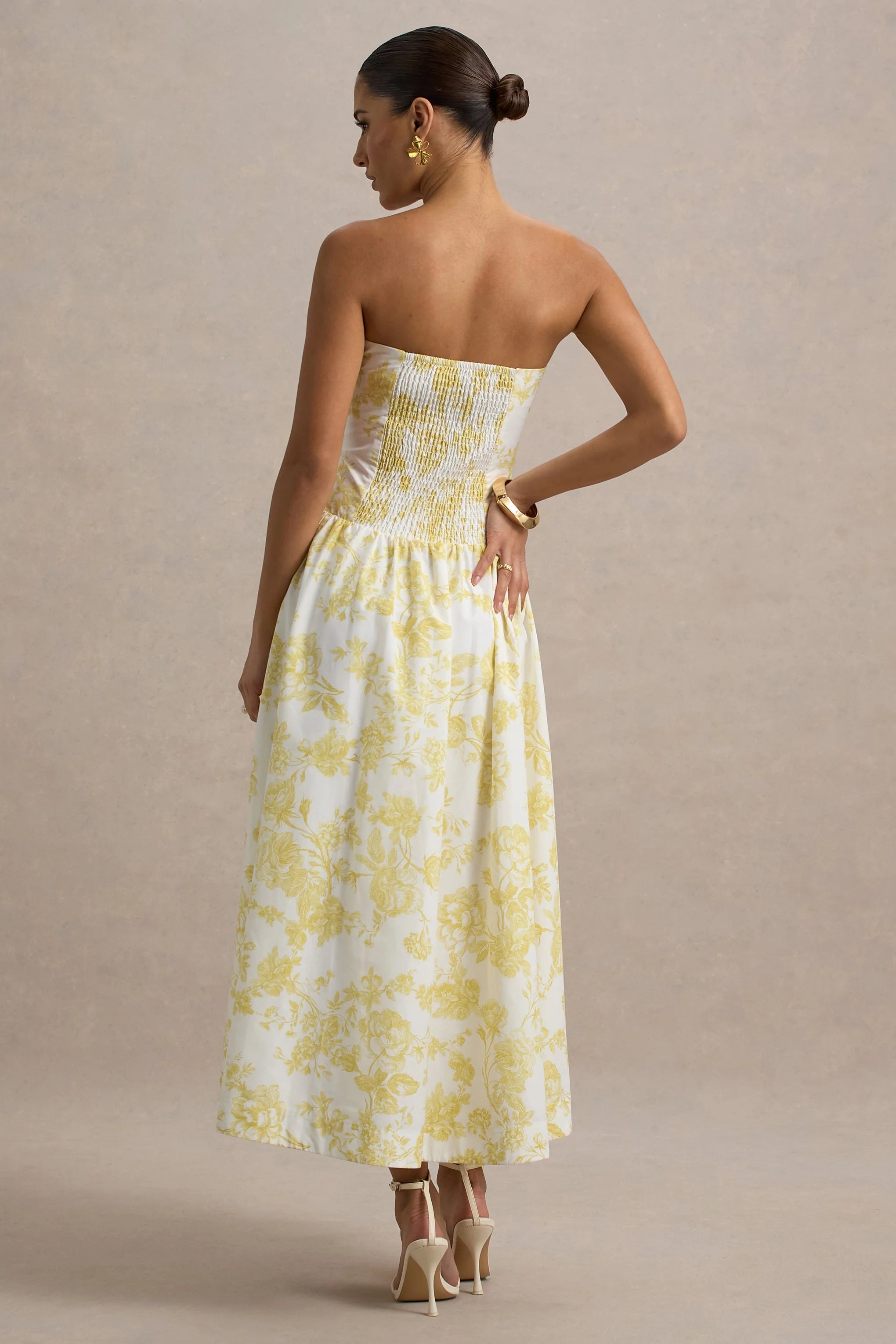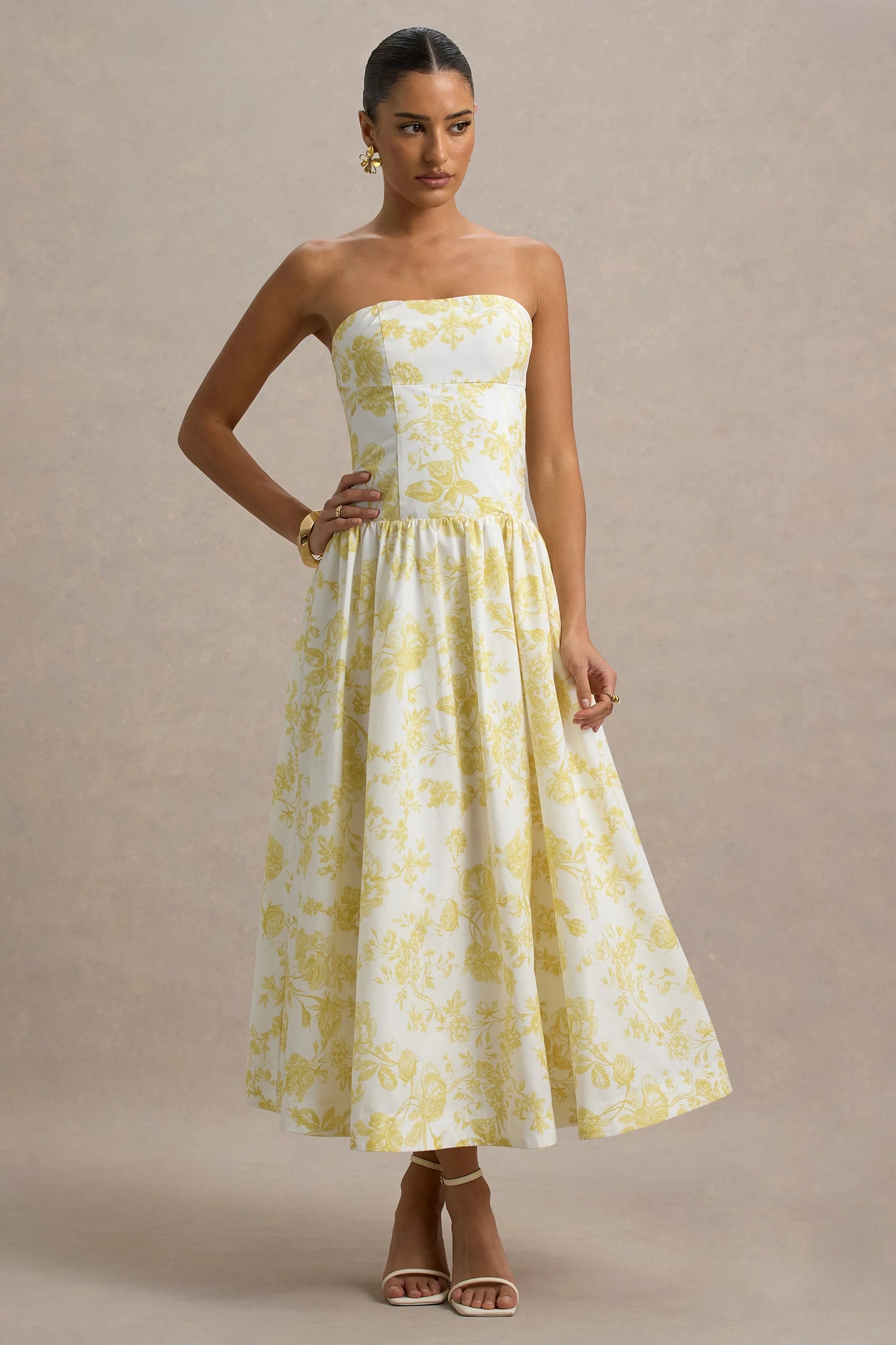 Floral and delicate, step into the season looking effortlessly chic in our Bluebell midi. This piece is curated in our premium cotton poplin, in a soft lemon porcelain print, for the ultimate spring summer look. Designed to flatter your figure, the bandeau neckline highlights and frames your shoulders whilst the boning detail enhances your waist and creates a dreamy silhouette. This dress will be your go to for all occasions this season.