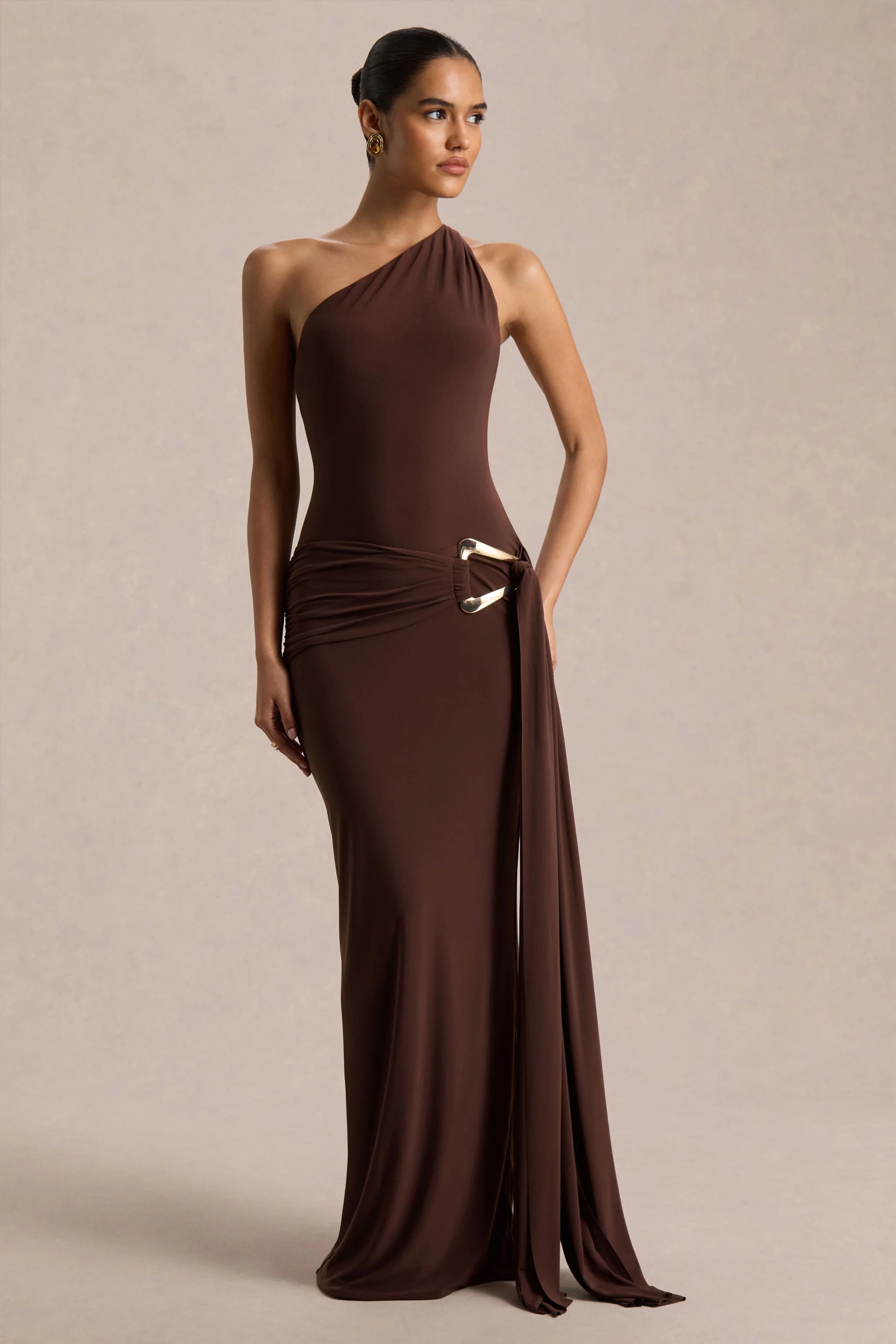 Command attention the moment you arrive in Bonnie, a sleek statement piece designed to sculpt. Cut in a classic brown shade of our premium stretch jersey and cut to a floor-sweeping maxi length, this gown is pure modern glamour. The asymmetric neckline brings modern edge, complemented by curve-enhancing ruching. A gold buckle detail draws focus at the waist, whilst the flowing sash cascades down adding soft movement. Finished with a striking open back, Bonnie is designed to make an unforgettable exit.