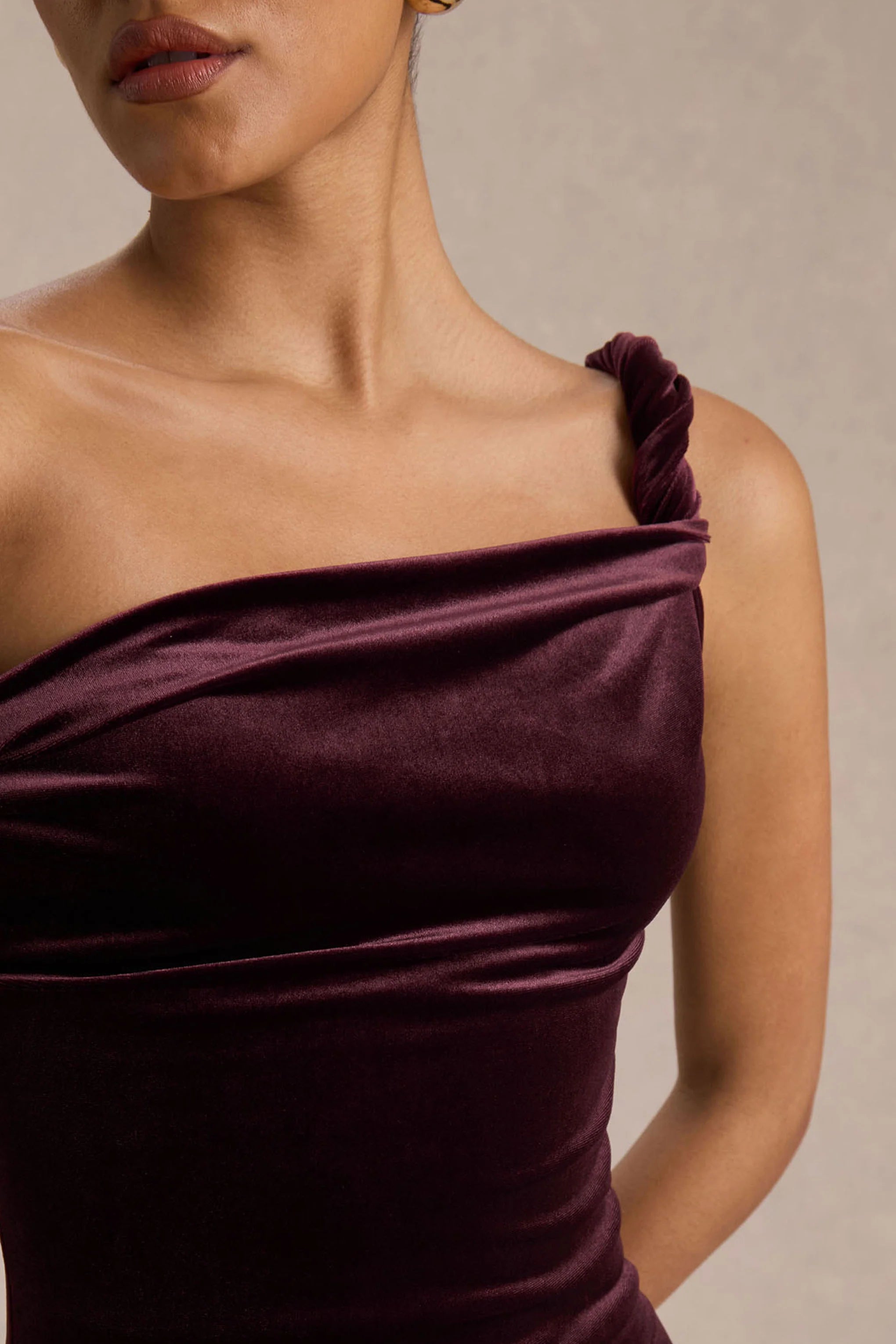 Defined by its luxurious texture and contemporary design, Carella is a striking choice for your next evening event. Crafted from our premium burgundy velvet, this midi dress features a twisted front detail that accentuates your waist and an asymmetric hemline that adds a touch of modern drama. The rich velvet fabric enhances your silhouette, while the unique neckline brings an elevated elegance to the look. Keep Carella in the spotlight with sleek stilettos and minimal jewelry, finishing the ensemble with a chic clutch and a soft wave in your hair for an effortlessly sophisticated finish.