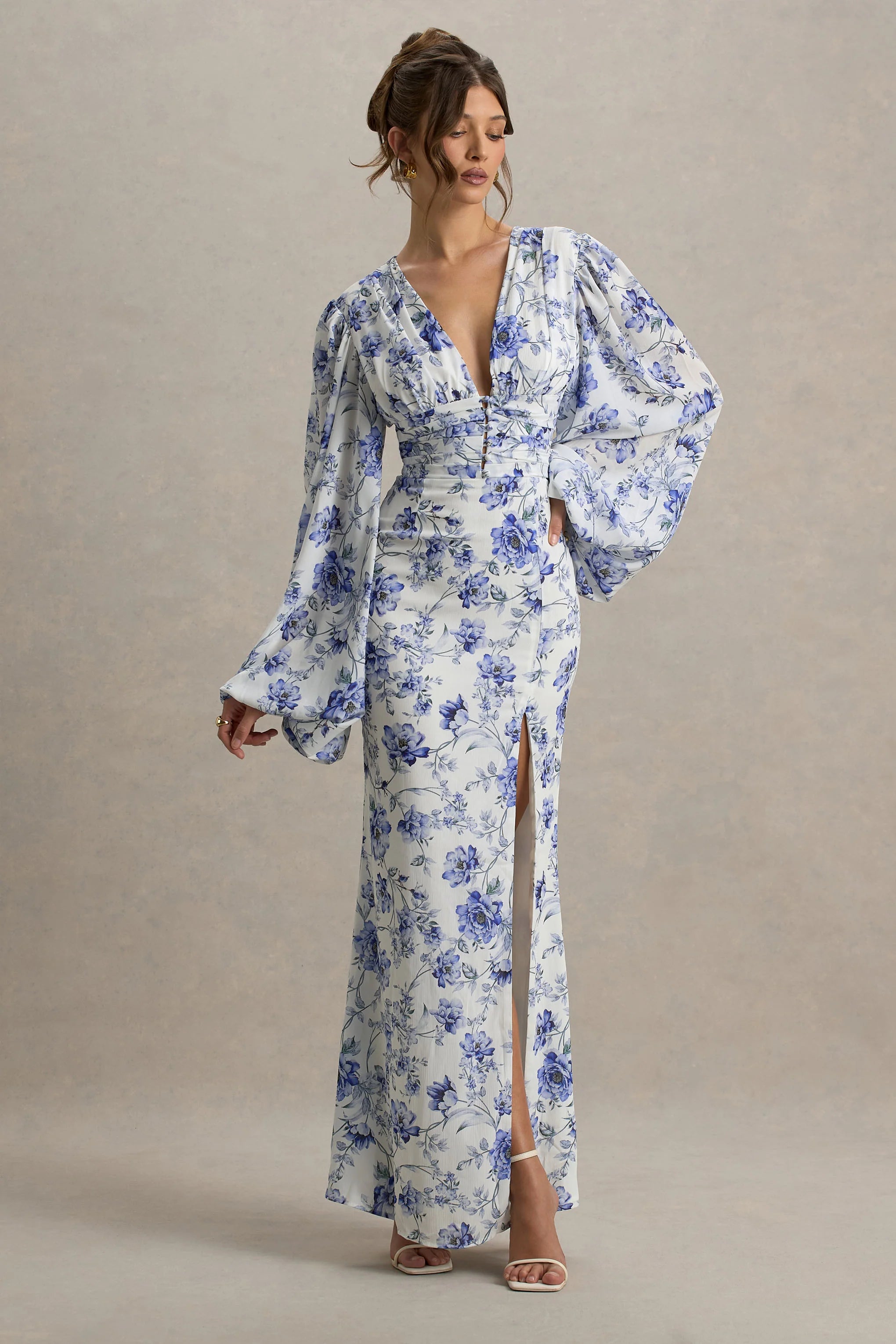 Floral with an edge of fierce, Casarile was made for sunset-infused nights. Cut to a slim fitting shape with exaggerated sleeves and a v neckline, this chiffon maxi dress is complete with a pleated cinched-waist and high-leg split. Compliment its blue tones with some golden accents this season.