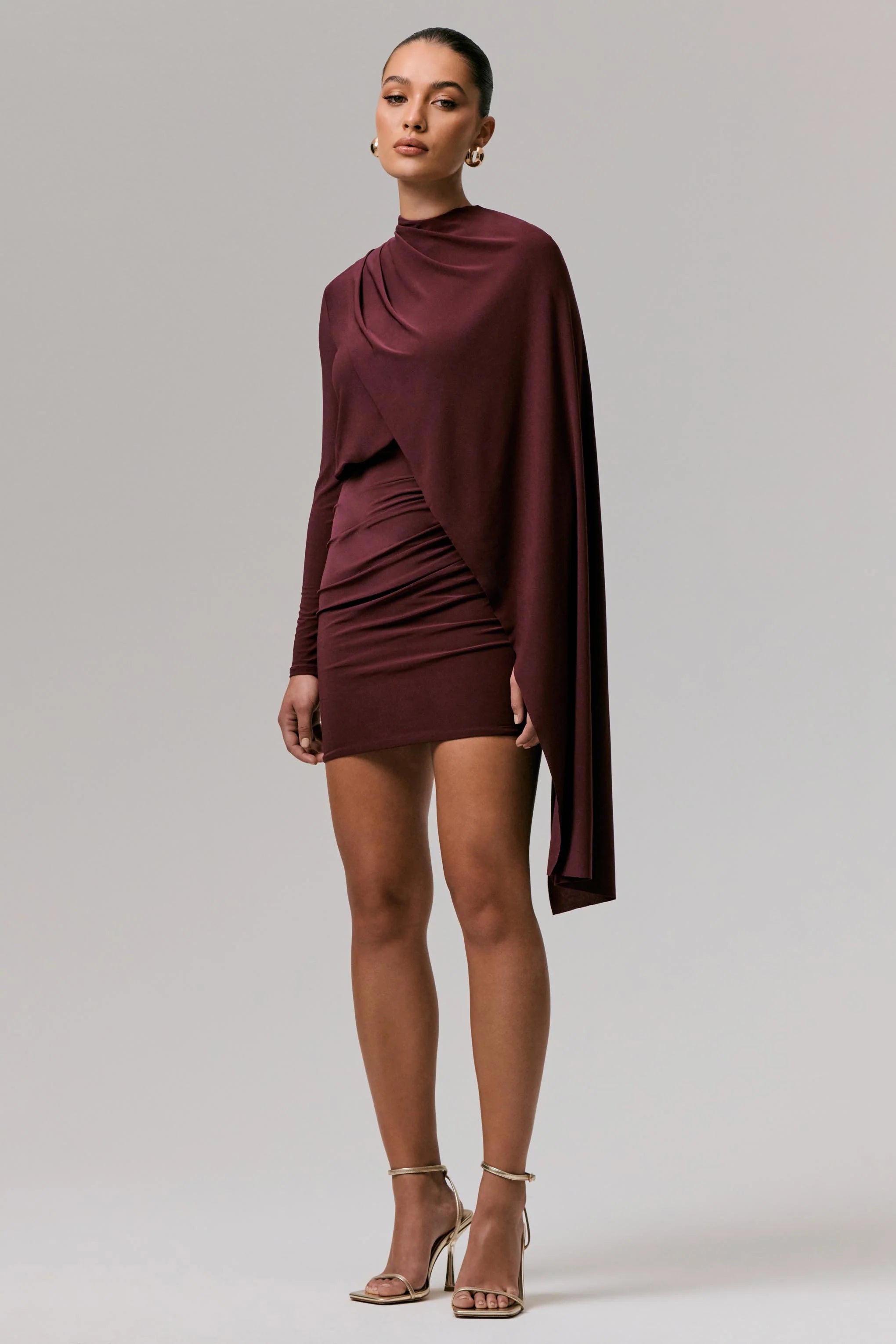 Command attention at your next formal affair in our mini Celeste. Arriving in our premium burgundy jersey, this piece showcases a striking cape sleeve for an effortlessly flattering silhouette. Pair yours with signature earrings for a look which blends sophistication and allure.