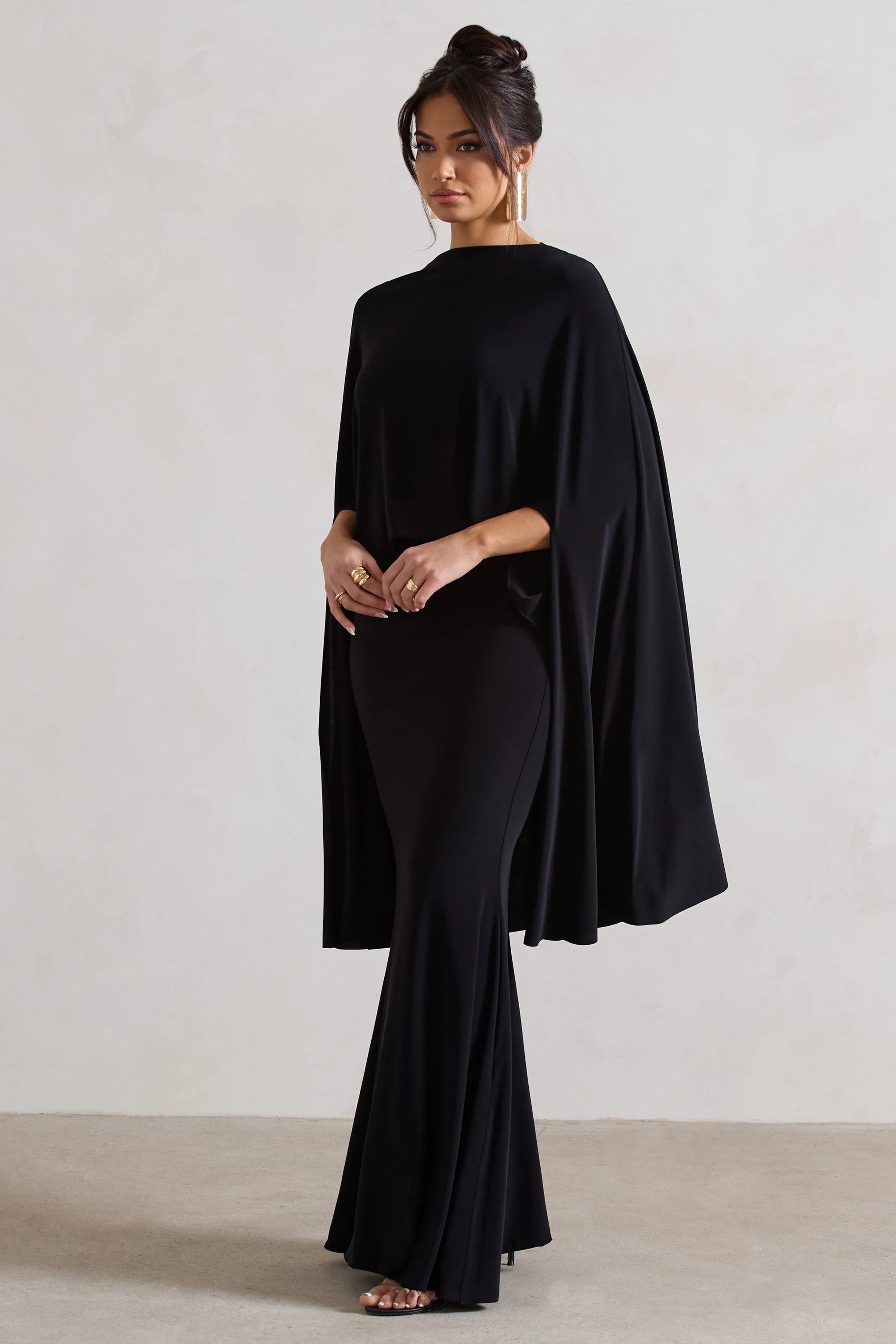 Wedding season calls for an elegant addition like Charmaine. Crafted in a classic black shade of our signature stretch jersey, this maxi is defined by an extravagant cape detail and demure high neckline. Flourished with some sparkling stilettos like Oh Please, this black maxi dress is perfect for any black tie event.
