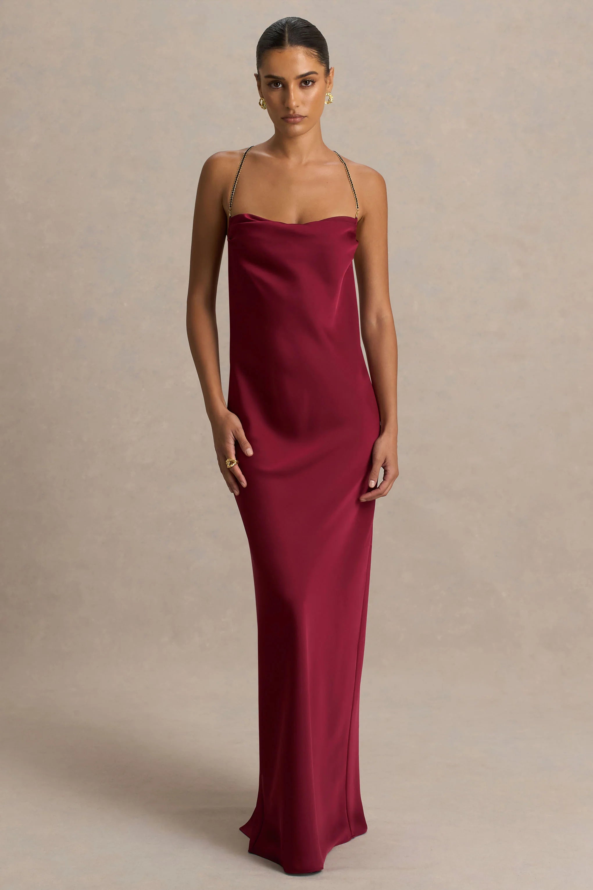 Cher is designed for unforgettable entrances and lingering exits. Crafted from our premium satin in a rich burgundy hue, this maxi dress drapes effortlessly, flattering the body with a sleek, fluid silhouette. The square neckline is elevated by embellished straps, catching the light with every move, while the open-back and dazzling embellished back detail add irresistible allure. Finished in a sweeping maxi length, Cher is the epitome of glamour with just the right amount of drama.