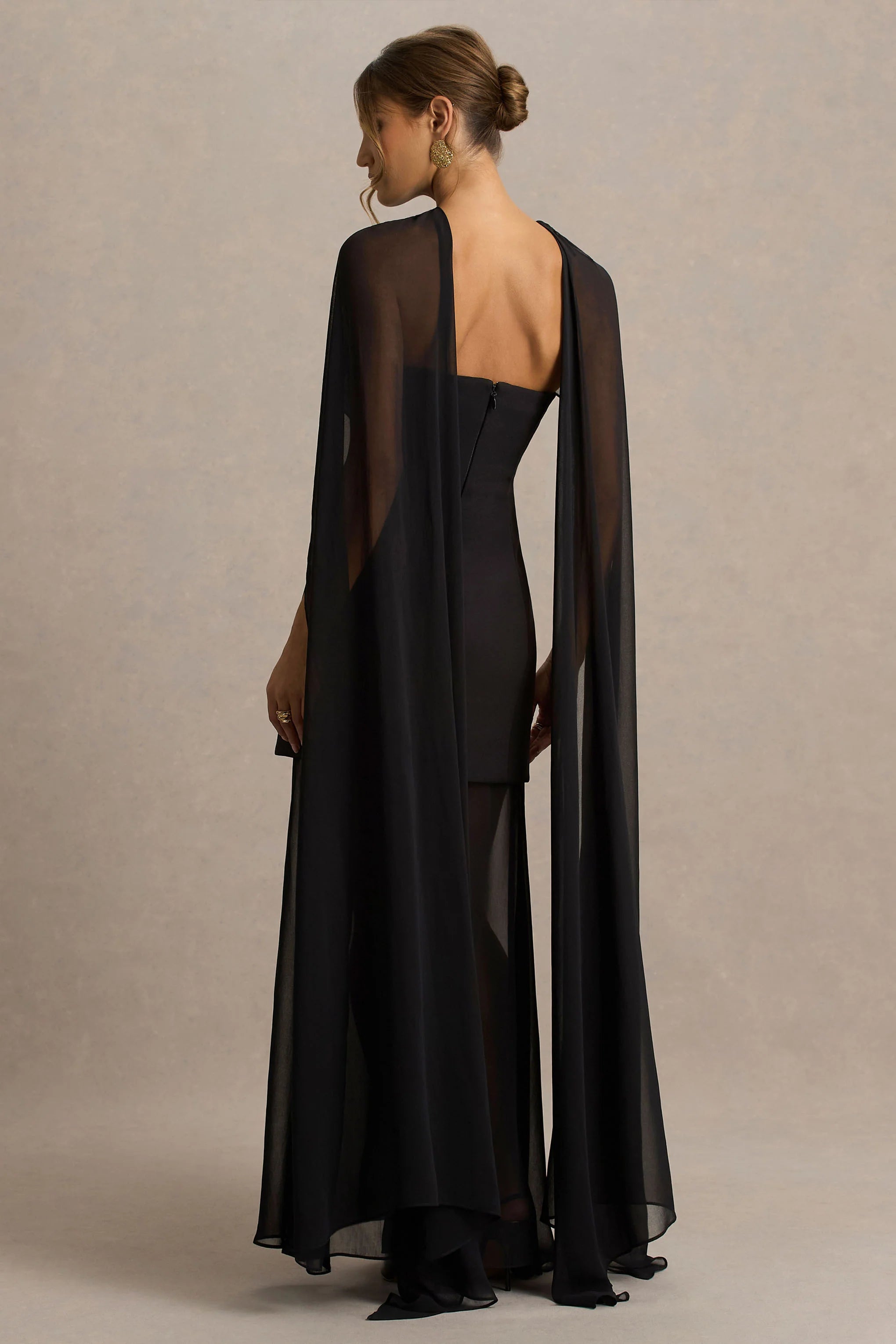 Say hello to Chessa, the maxi dress that commands attention. Crafted from our premium black crepe, its floor sweeping maxi length flatters the figure with effortless elegance. The high neckline adds a touch of sophistication, while a sheer cape and sheer skirt bring drama and movement to every step. Finished with a front high-split, Chessa is your go-to for a sultry take on occasion wear.