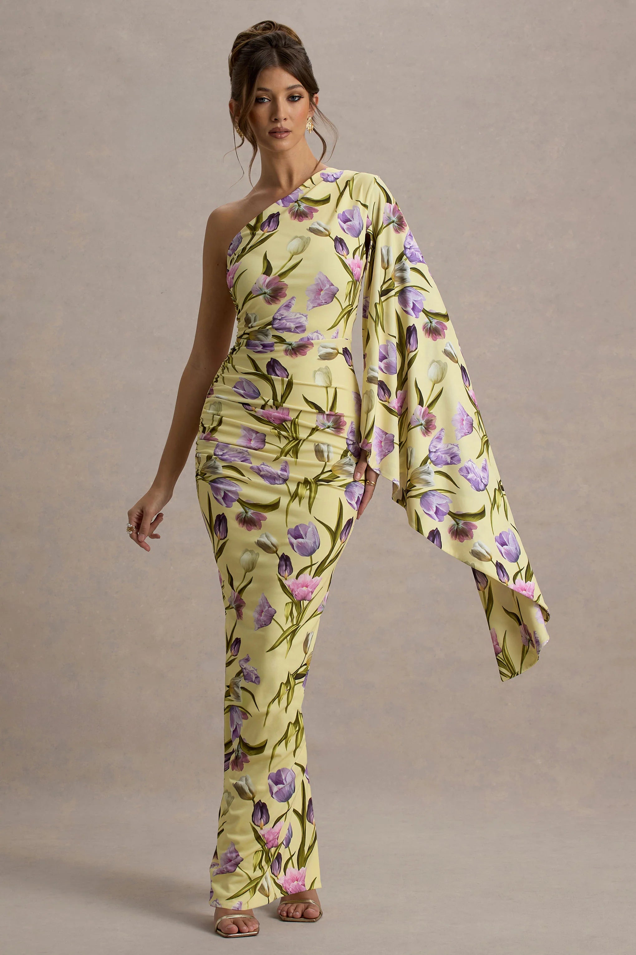 Characterized by its romantic flair and graceful design, Clementina is an exquisite choice for your next special event. Draped in a tulip floral print, this maxi dress is crafted from premium jersey for a soft, flattering fit. The asymmetric cape sleeves add a touch of whimsical elegance, while the flowing silhouette creates a timeless, ethereal appeal. Perfect for garden parties or evening soirees, let Clementina take centre stage with simple jewellery and understated heels for a look that’s effortlessly enchanting.