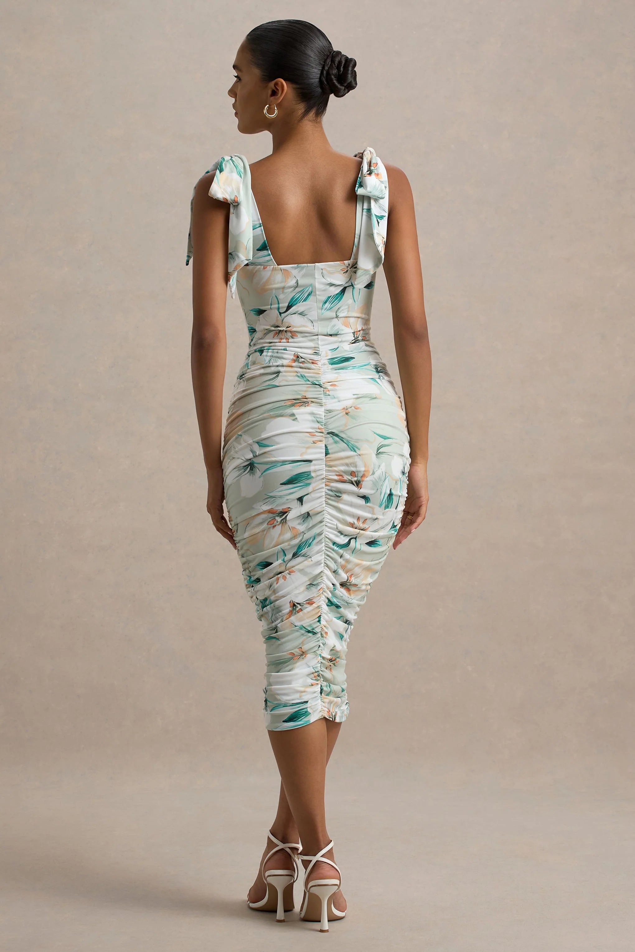 Look captivating and contoured this occasion season in Cordelia. This flattering green floral print midi dress has been expertly cut in a premium stretch jersey, with a ruched bodice for a sculpting fit. Detailed with feminine bow straps Cordelia is a must have midi for your next garden party.