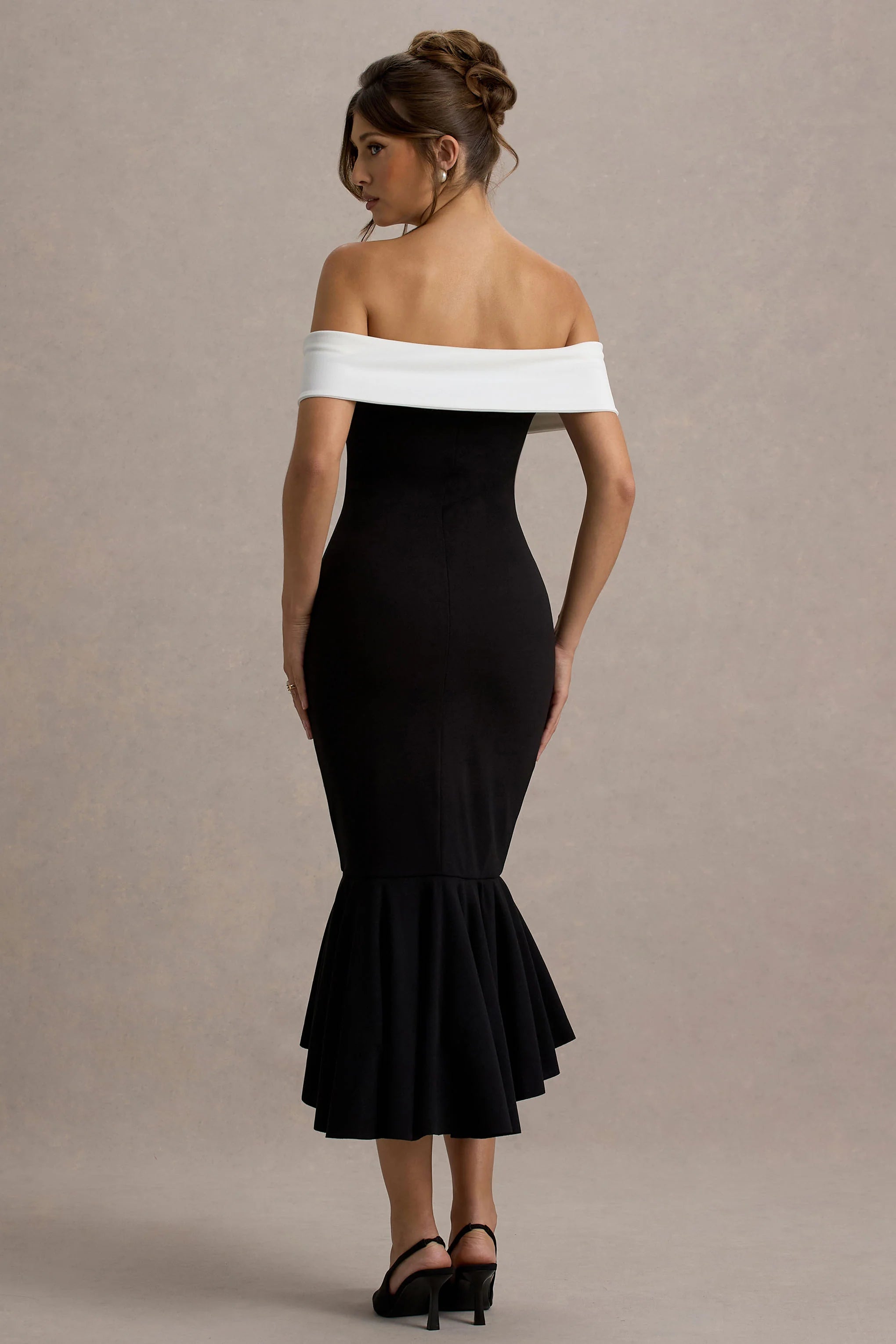 An elegant and sophisticated choice for your next special event, Corola has just landed. Crafted in our premium black and white scuba crepe, this piece comes decorated with a gorgeous contrast bardot and a volume peplum hem. Style your Corola with sleek accessories to make a statement.
