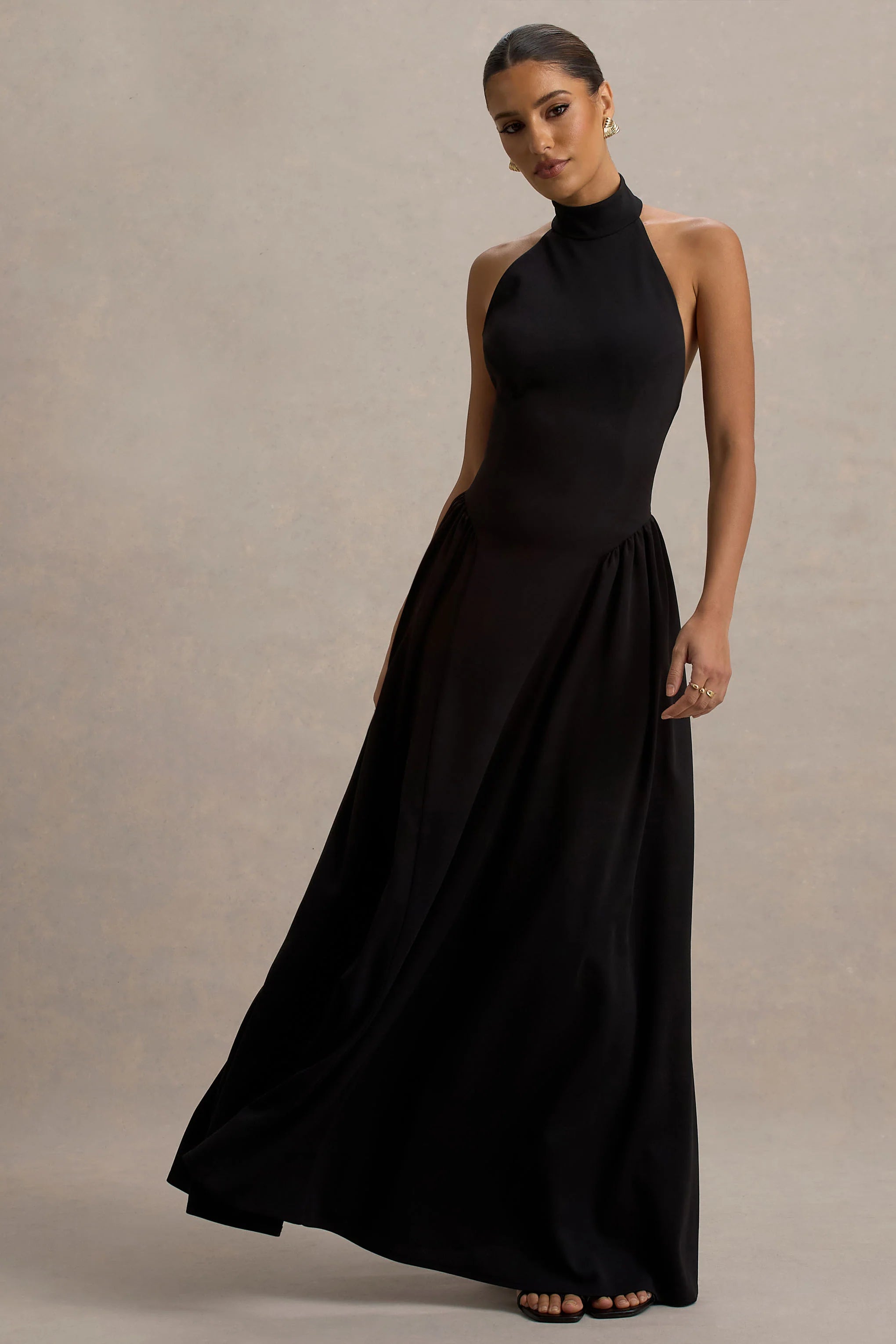 Arrive at your next dinner party in style with our latest maxi Cynthia. Featuring a flattering high neckline which cascades elegantly into an open back and volume skirt, this black premium scuba crepe piece will quickly become your go-to. What's not to love about Cynthia?