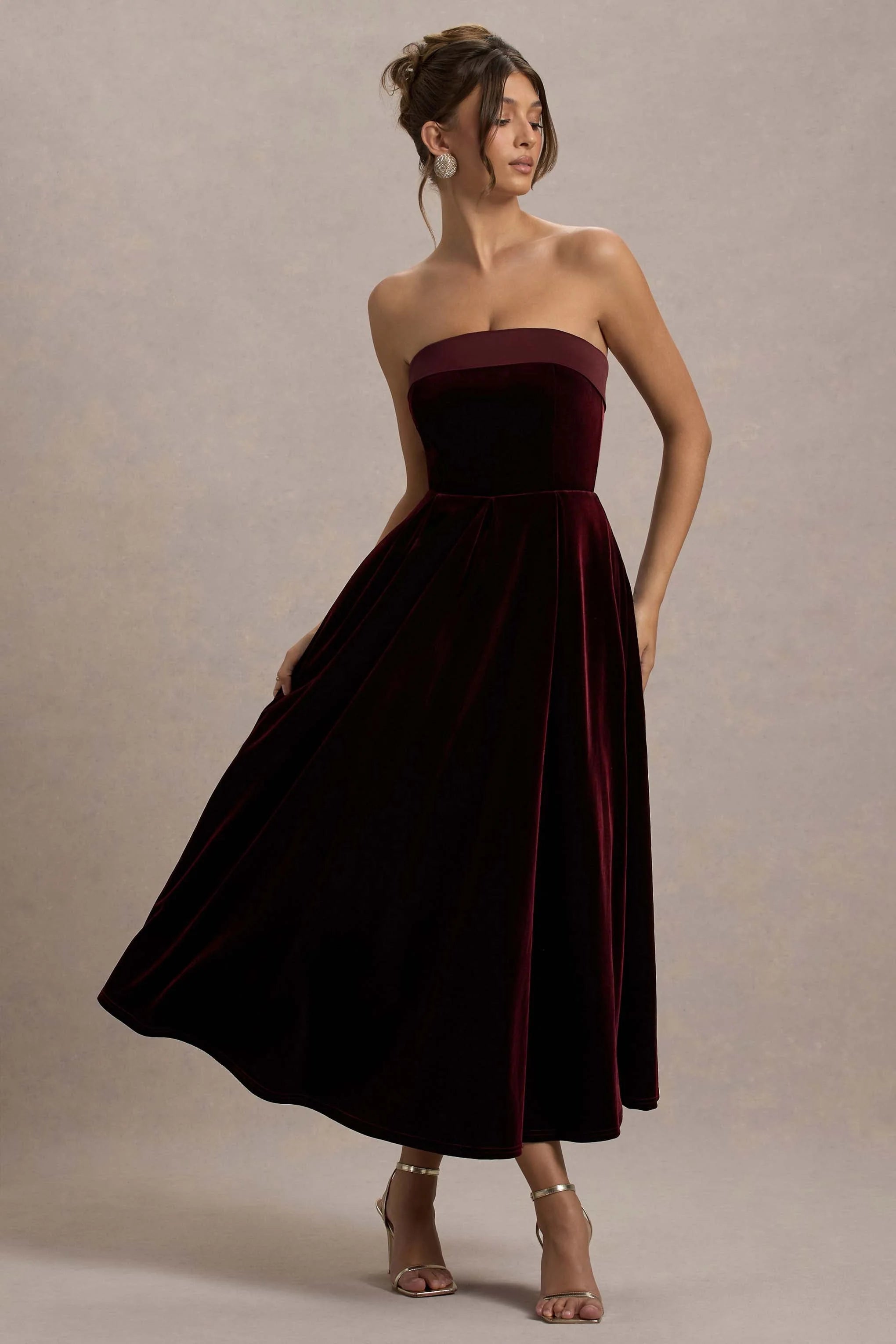 Defined by its rich texture and timeless elegance, Delray is a sophisticated choice for your next special occasion. Wrapped in our premium port velvet, this bandeau midi dress is designed to highlight your silhouette with its sleek, fitted shape. The subtle satin detailing adds a touch of refinement, elevating the overall look. Perfect for an evening soiree or a formal dinner, keep Delray in focus with minimalist accessories and classic heels to exude effortless grace and style.