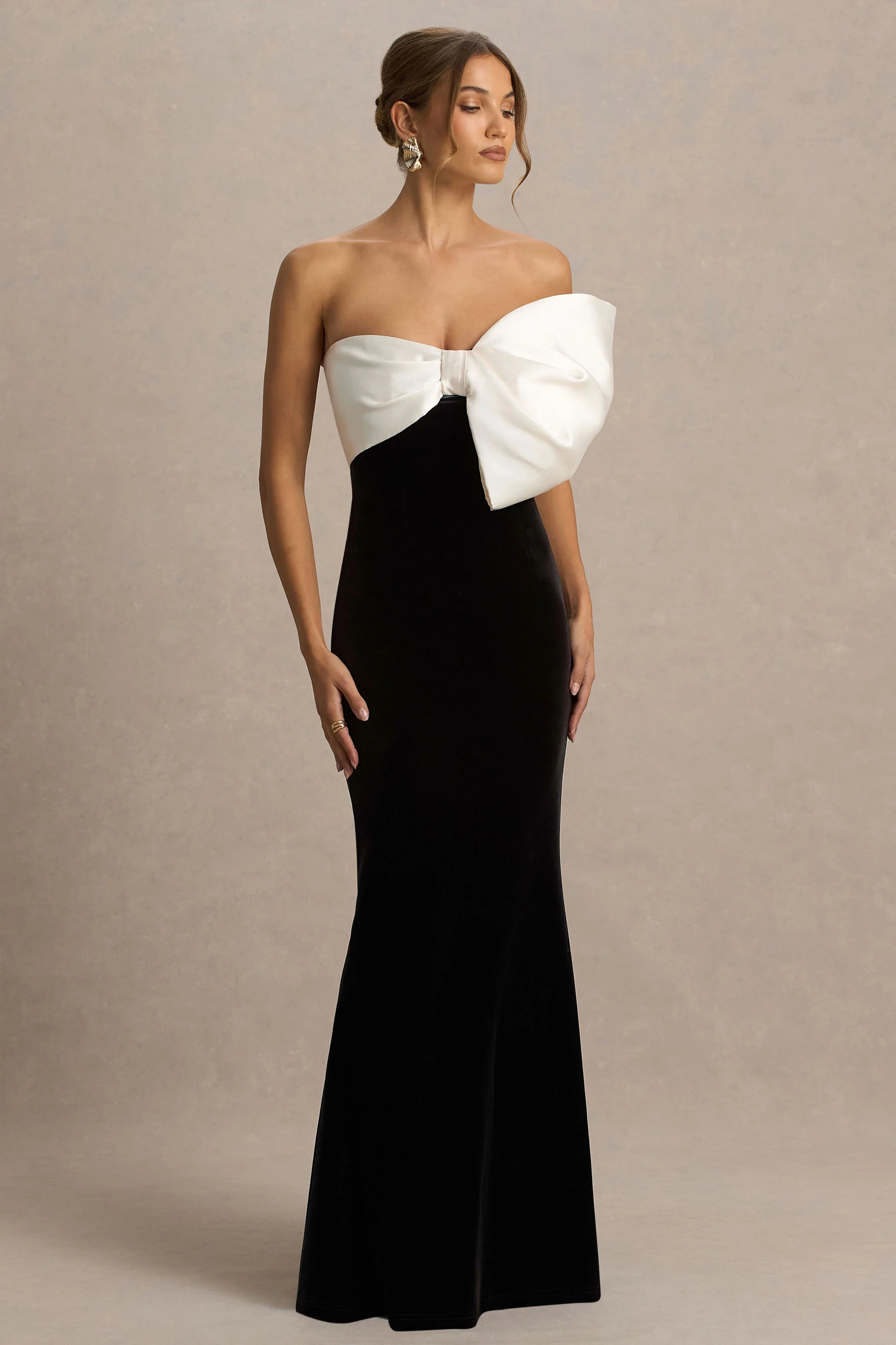 Say hello to Divulge, a showstopping design that defines modern sophistication. Crafted from our premium black velvet, this maxi dress exudes timeless allure with its sculpted silhouette and elegant drape. The asymmetric white satin bow neckline adds a striking contrast, creating a statement look that balances boldness and grace. Finished sleeveless for a refined edge, Divulge is the perfect choice for evenings that call for unforgettable glamour.