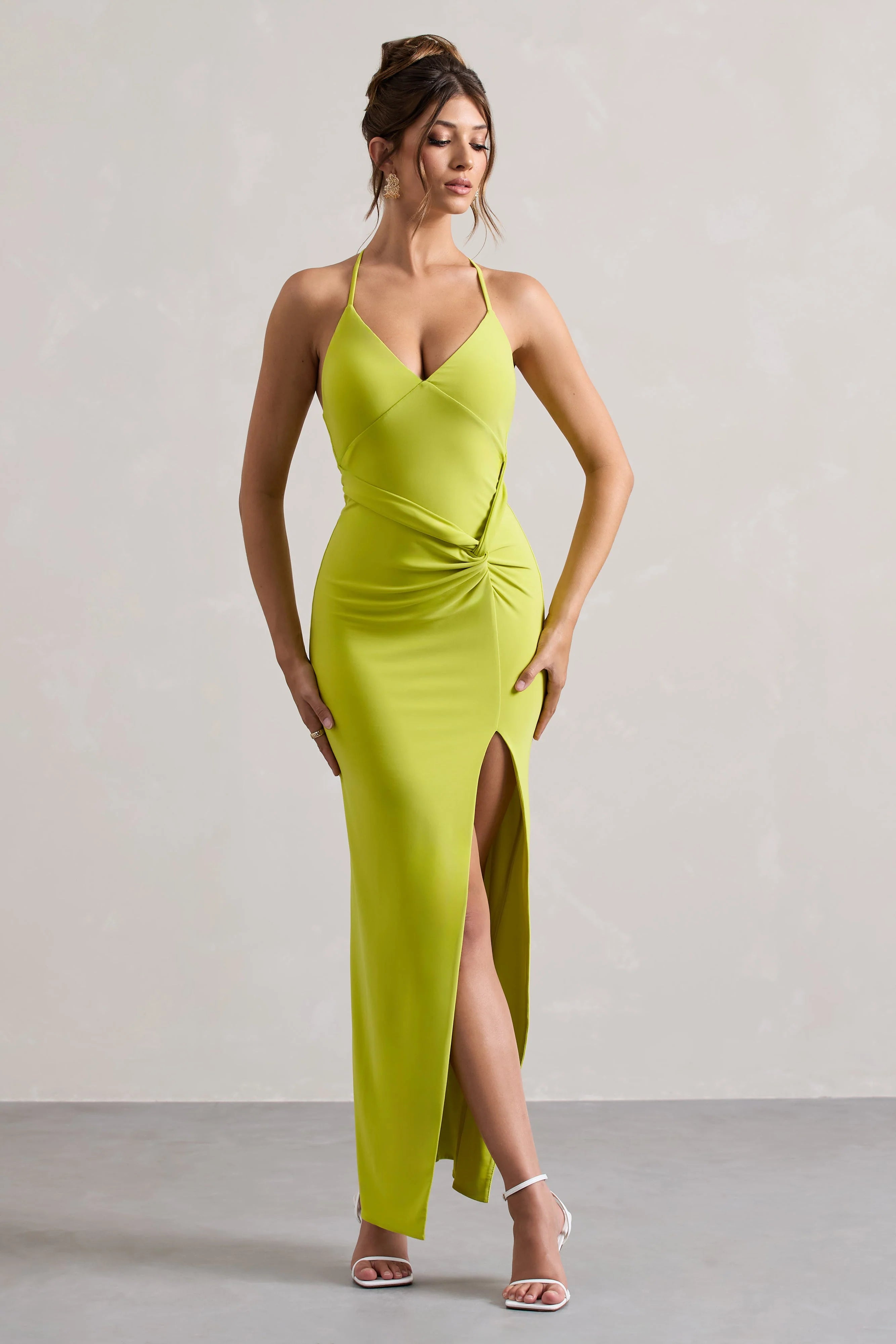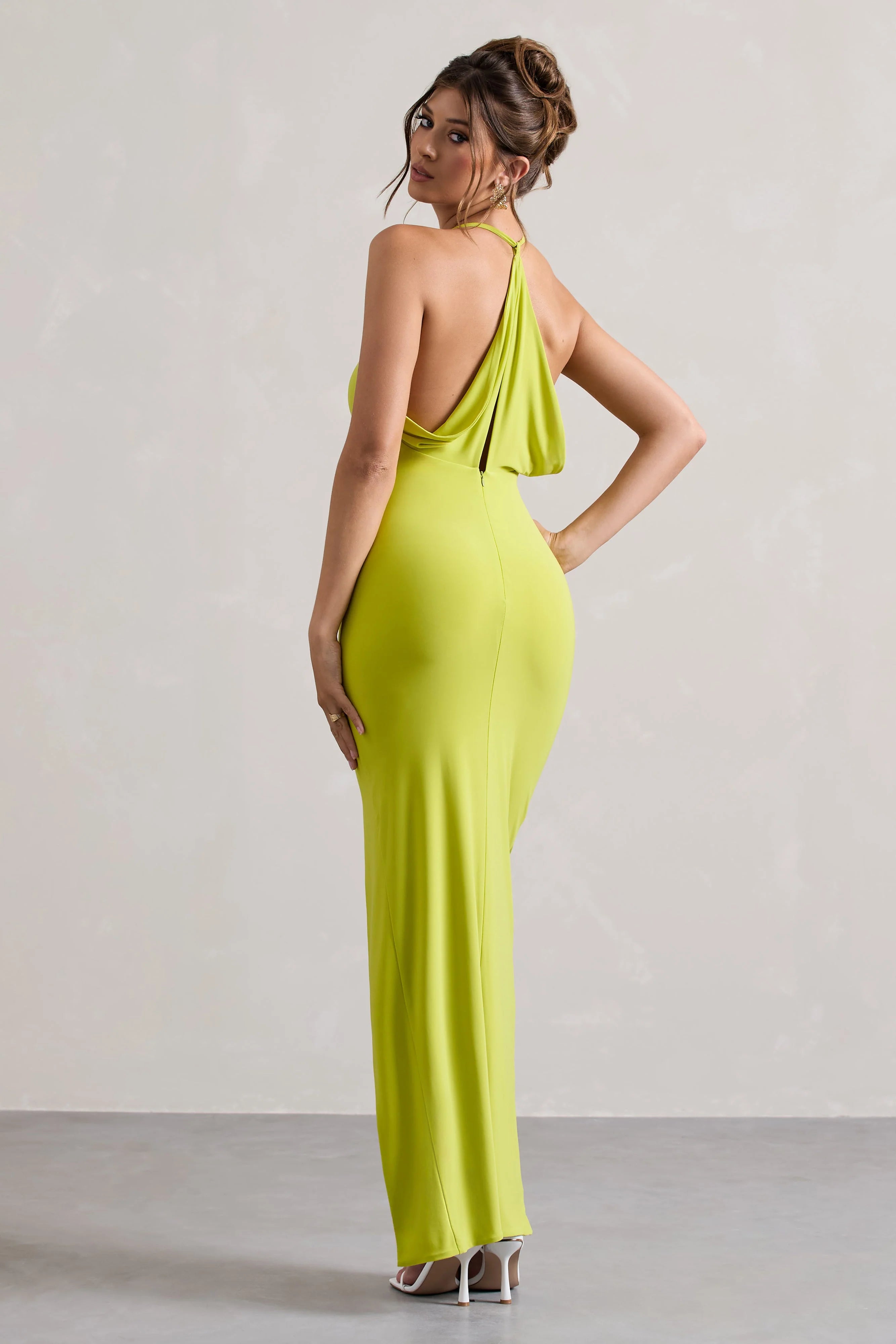 Dare to dream in Domenica, our latest statement maxi dress. Arriving in a bold lime green shade of our signature jersey that's effortlessly flattering. Domenica boasts a halter neckline, a flattering cowl racerback and a knotted wrap skirt for an ultra sculpting fit. Keep this maxi at the forefront with a sleek bun and some gold accents.