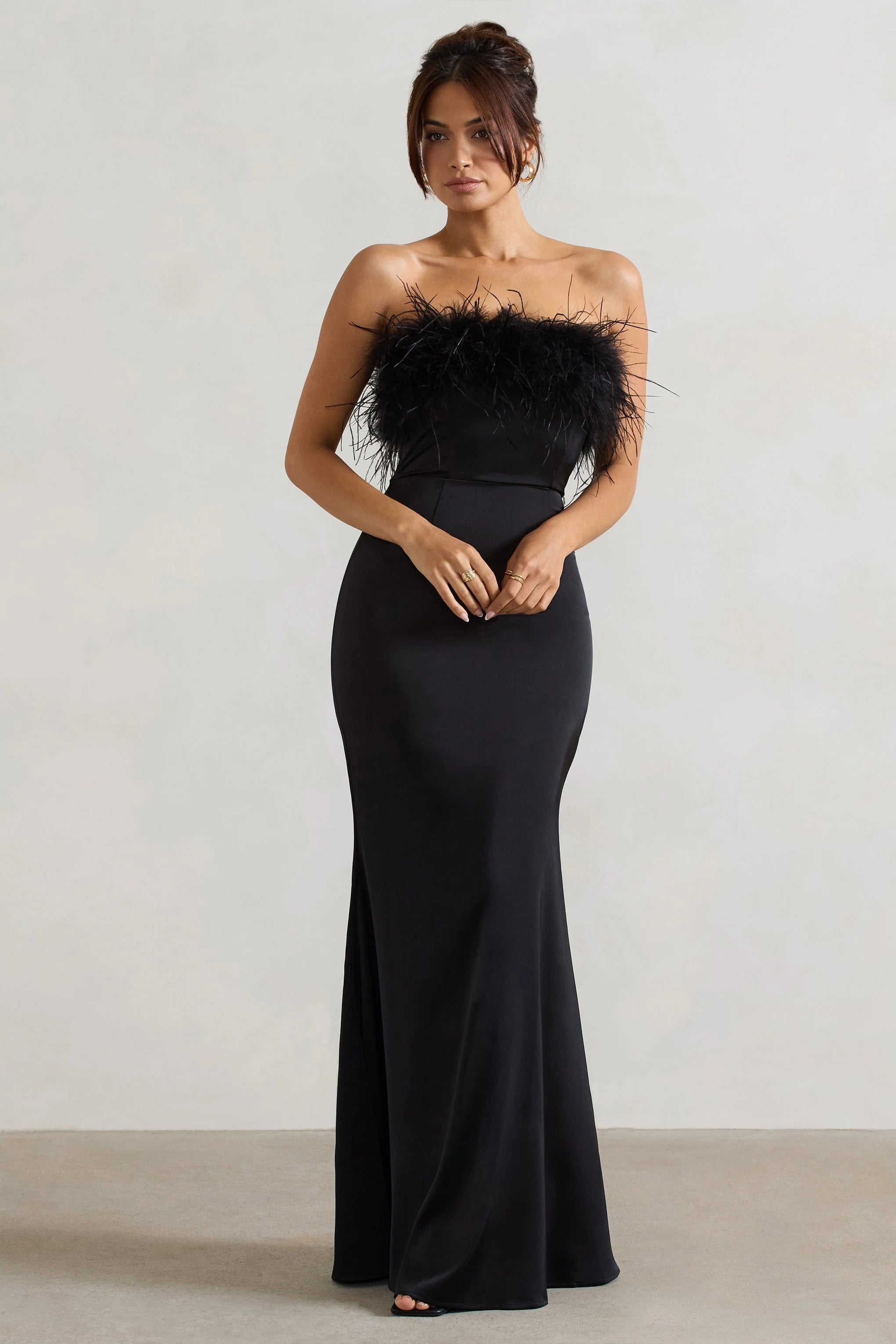 It's the start of the occasion season and you need Dress For It. This effortlessly glamorous gown has been crafted in a timeless black shade of premium satin, and its strapless neckline is finished with fluffy feathers creating the ultimate black tie attire.