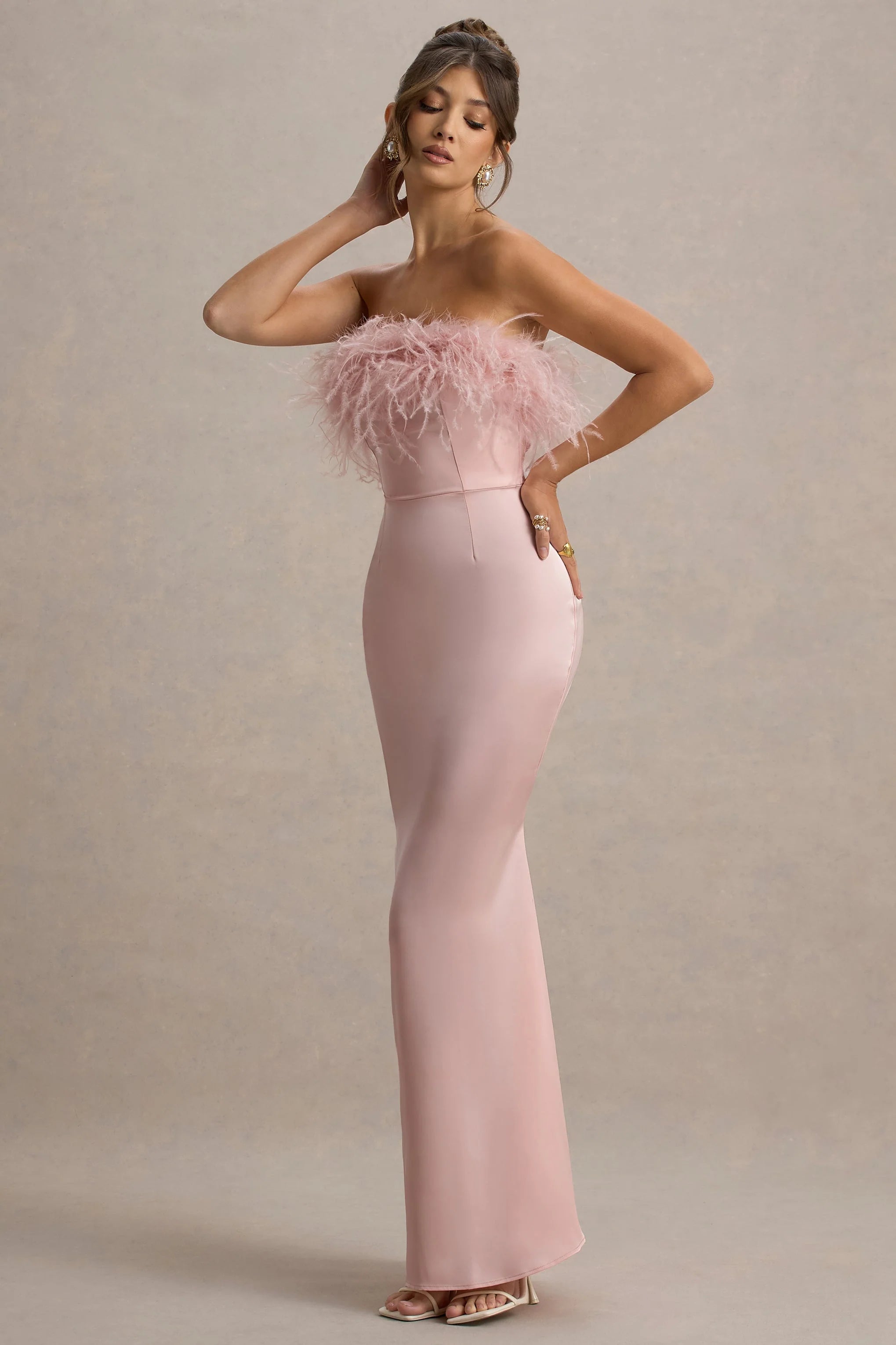It's the start of the occasion season and you need Dress For It. This effortlessly glamorous gown has been crafted in a timeless pale pink shade of premium satin, and its strapless neckline is finished with fluffy feathers creating the ultimate black tie attire.