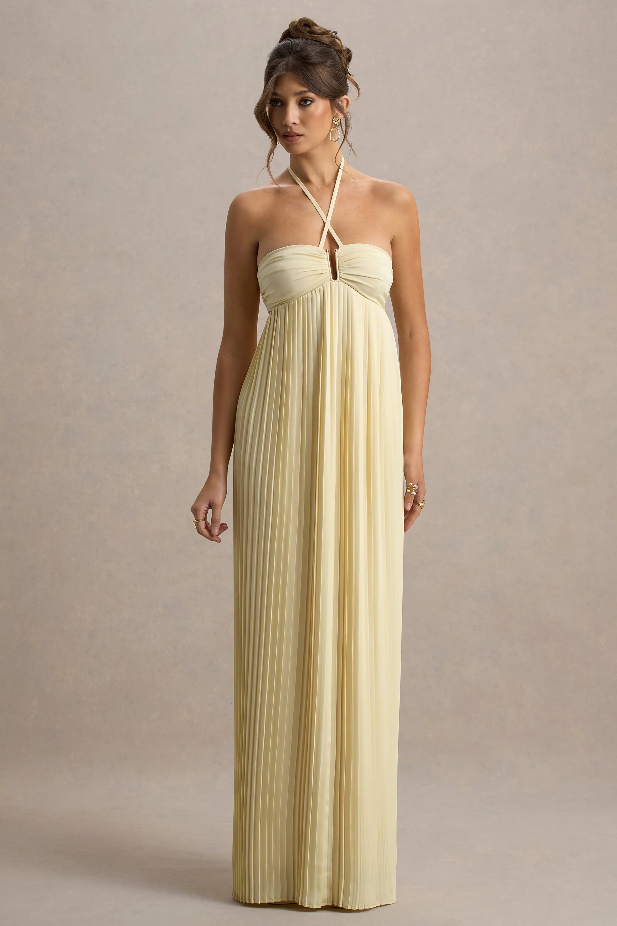 Radiate effortless elegance in Elayne the must-have maxi for sun drenched celebrations and unforgettable evenings. Designed in our premium stretch satin in a pale lemon hue, this dress cascades beautifully with a flowing pleated skirt, creating graceful movement with every step. The striking gold U-shaped detail at the chest adds a luxe touch, while the functional halter neck tie allows for a flawless, adjustable fit. This maxi will be your go-to for summer events and rooftop cocktails this season.