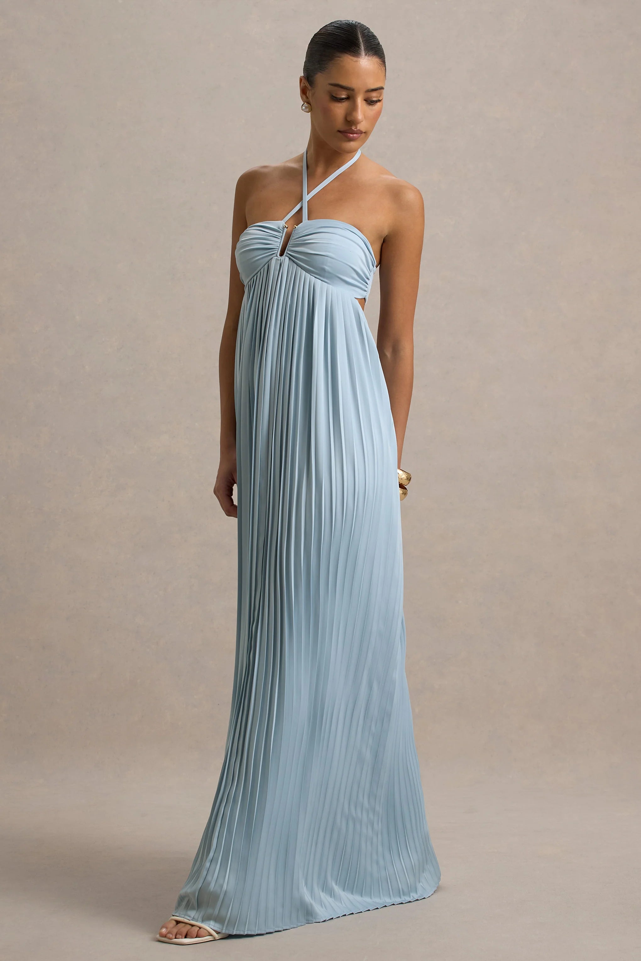 Radiate effortless elegance in Elayne the must-have maxi for sun drenched celebrations and unforgettable evenings. Designed in our premium stretch satin in a powder blue hue, this dress cascades beautifully with a flowing pleated skirt, creating graceful movement with every step. The striking gold U-shaped detail at the chest adds a luxe touch, while the functional halter neck tie allows for a flawless, adjustable fit. This maxi will be your go-to for summer events and rooftop cocktails this season.