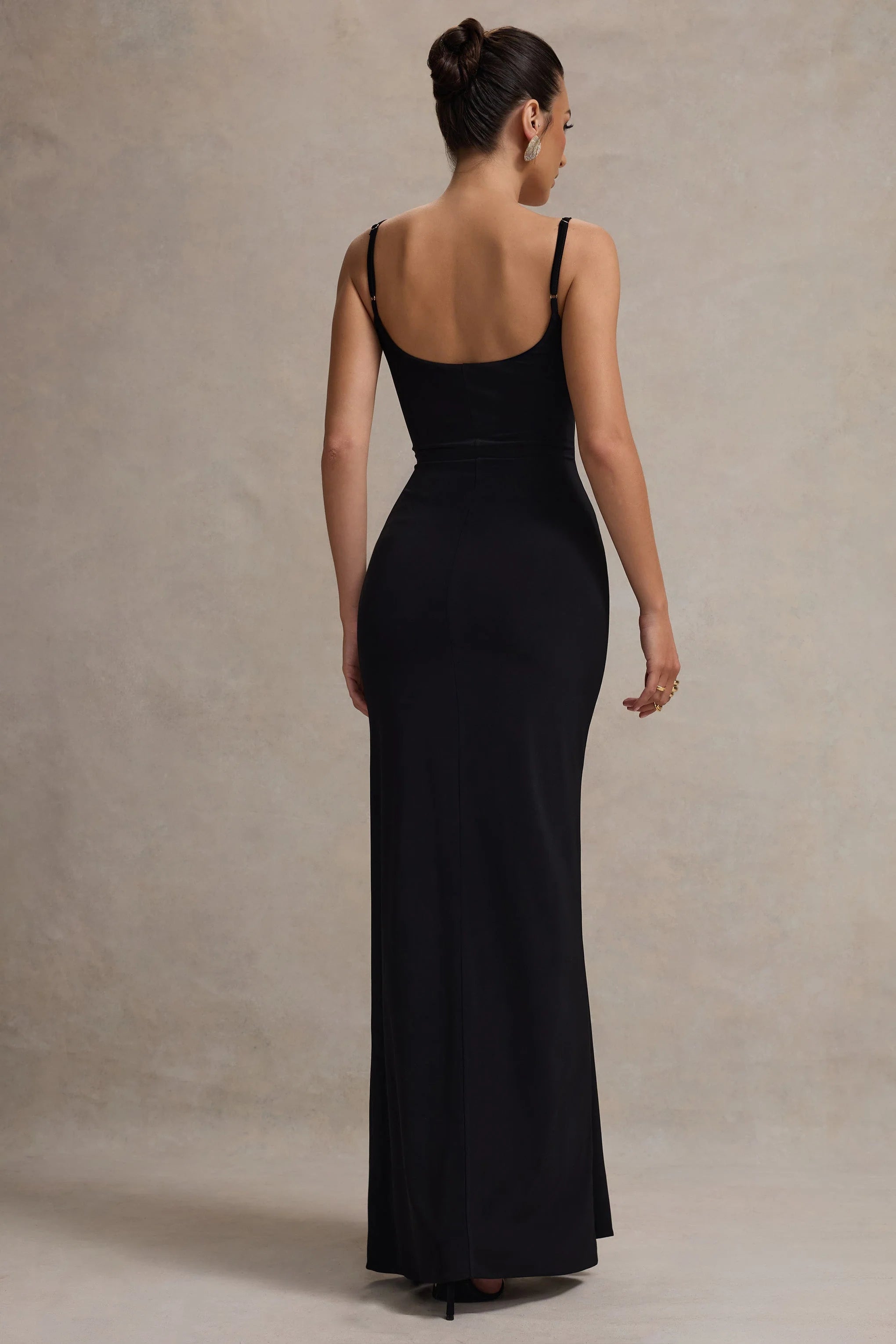 Indulge yourself in luxury this event season in Emmalou, our charming maxi dress. Carefully crafted in our signature stretch jersey, this black maxi boasts a subtle chest cut-out, adjustable cami straps and high-leg split. A contrasting white bow bralet is the star of all features, making this the perfect statement piece for that special occasion.