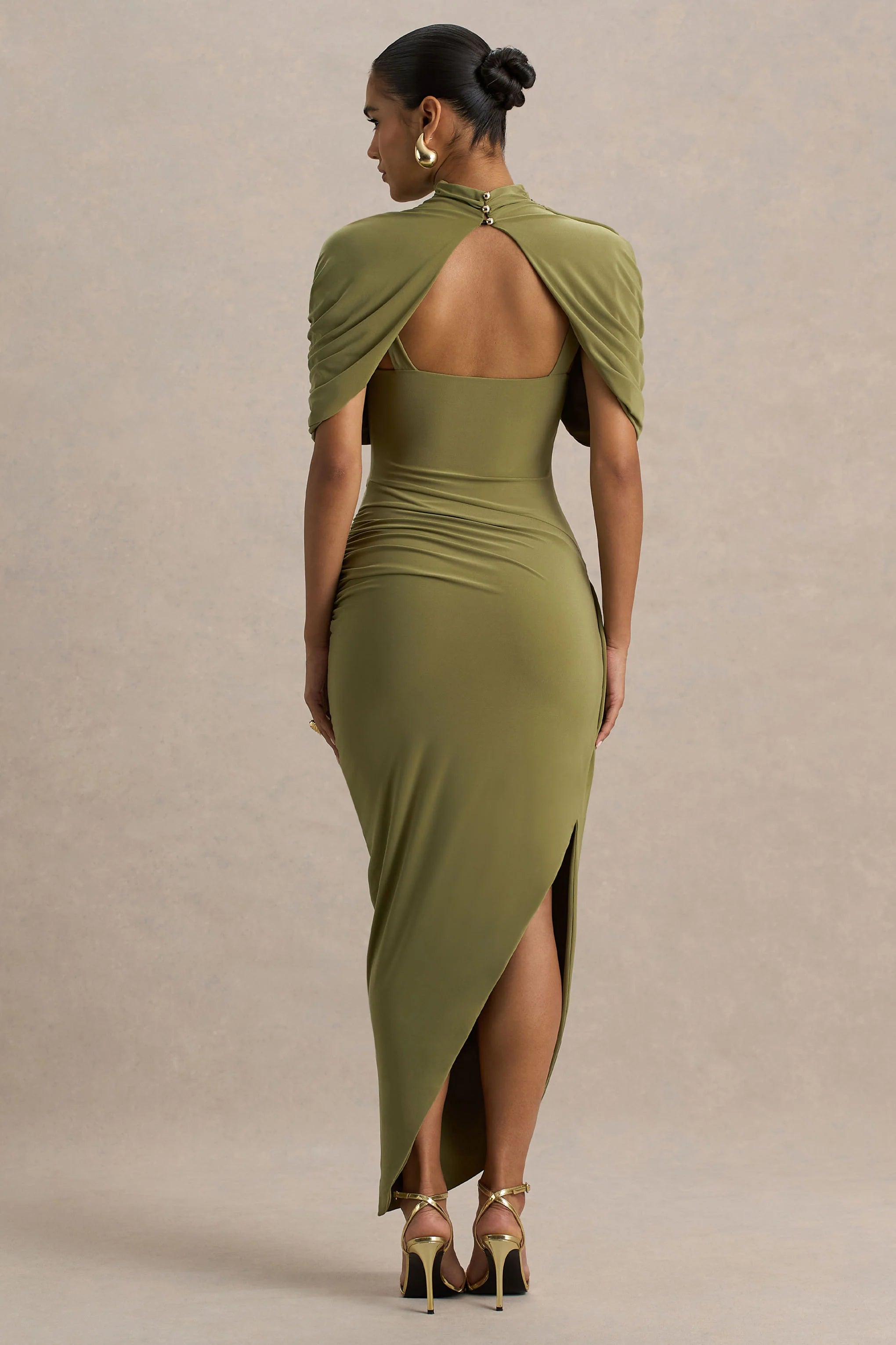Sophistication and glamour at its finest with our Enchant Midi. Cut in our premium stretch jersey in a bold shade of olive, this dress will flatter your figure from every angle. The high neckline and cape sleeves make it the perfect piece for an elegant occasion. Style it up with a statement earing for the ultimate look.
