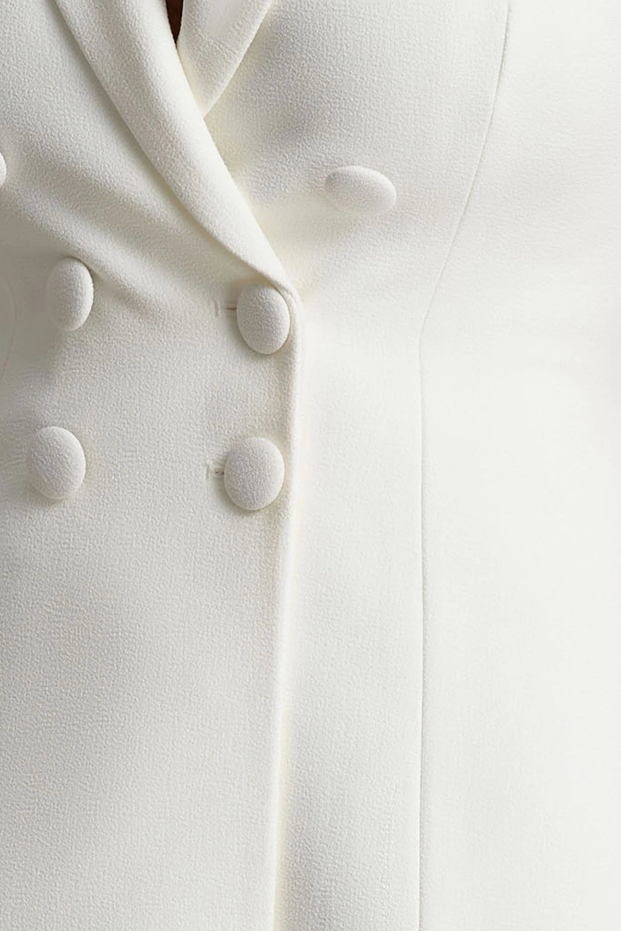 Etta is power dressing with a feminine twist. Tailored from our premium white crepe, this mini dress reimagines the classic blazer. Cut with a plunge collared neckline and sharp cap sleeves, this piece makes a bold statement in every room. The double-breasted silhouette is detailed with self-covered buttons for a sleek, polished finish. Style with heels and gold accessories for a captivating look.