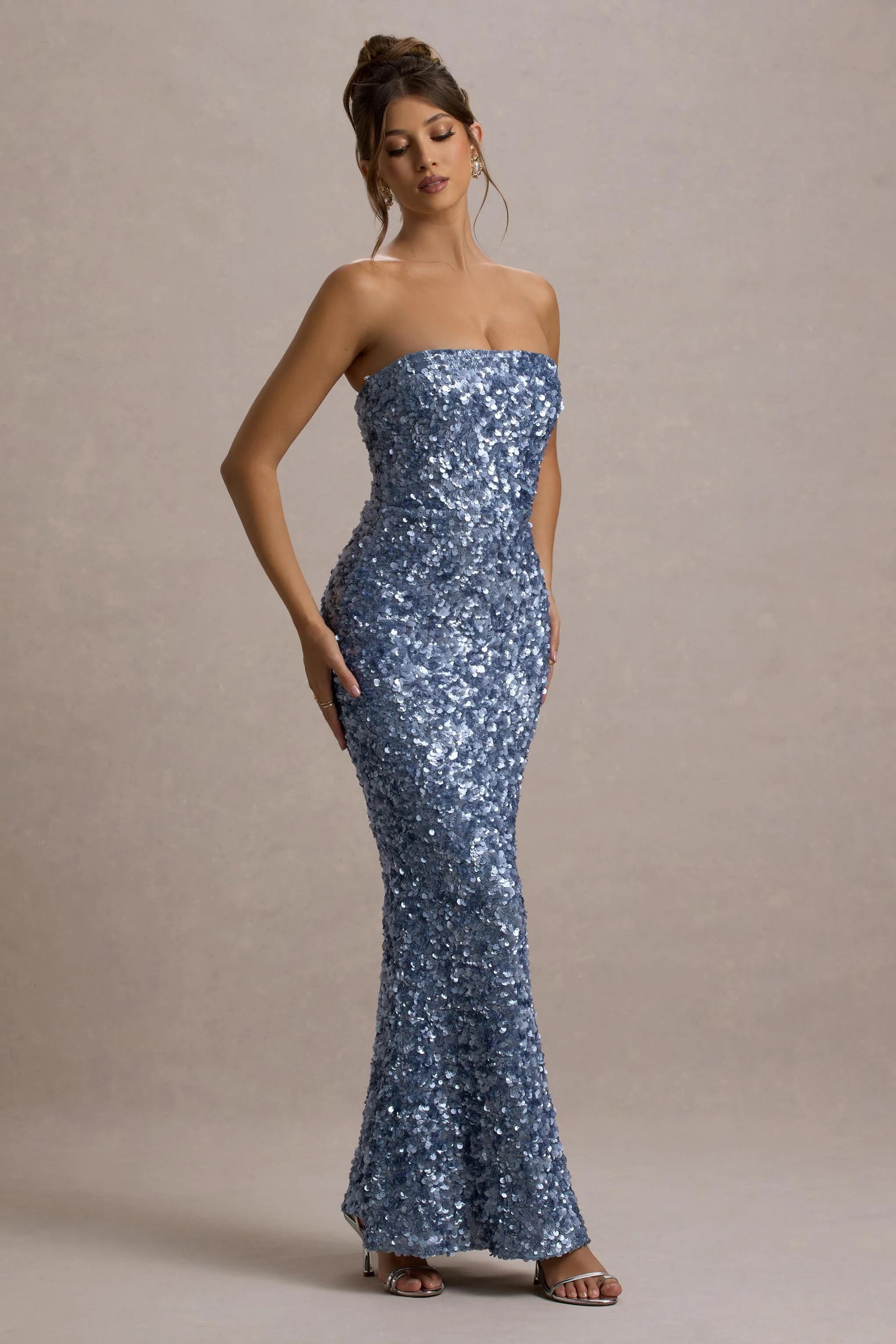 Defined by a cascade of eye-catching powder blue sequins, Evabeth is an exquisite option for your next unforgettable occasion. This strapless maxi dress is designed with a structured silhouette that enhances your curves, offering both glamour and elegance. Complete with a floor-grazing hem, Evabeth is made to shine on the dancefloor—perfect it with sleek hair and your favourite heels for a look that steals the spotlight.