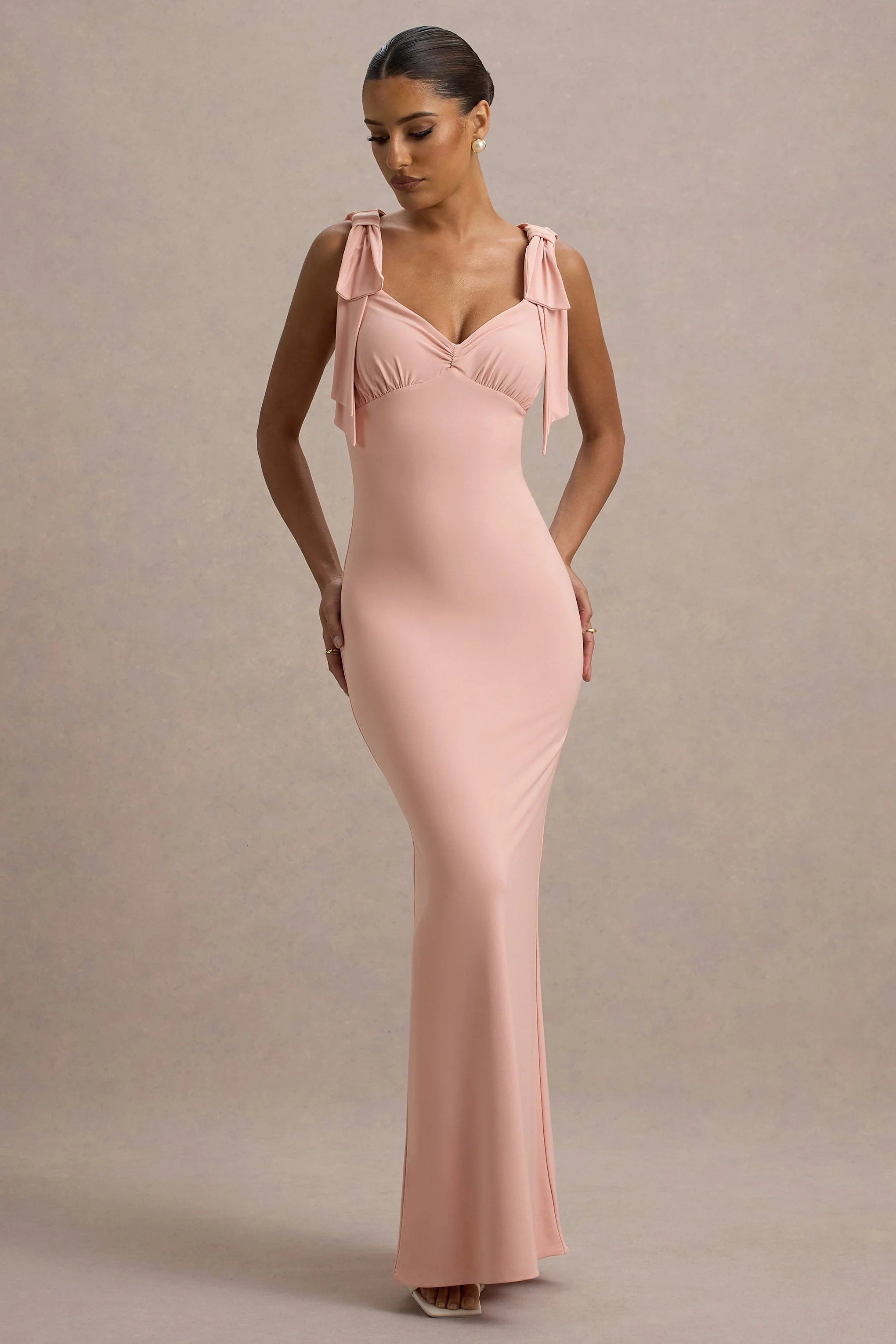 Get garden party ready in Evanna, our ethereal maxi dress. Arriving in a pastel pink shade of our premium jersey, this pretty piece is defined by bow-inspired straps, a v neckline and floor-length skirt.