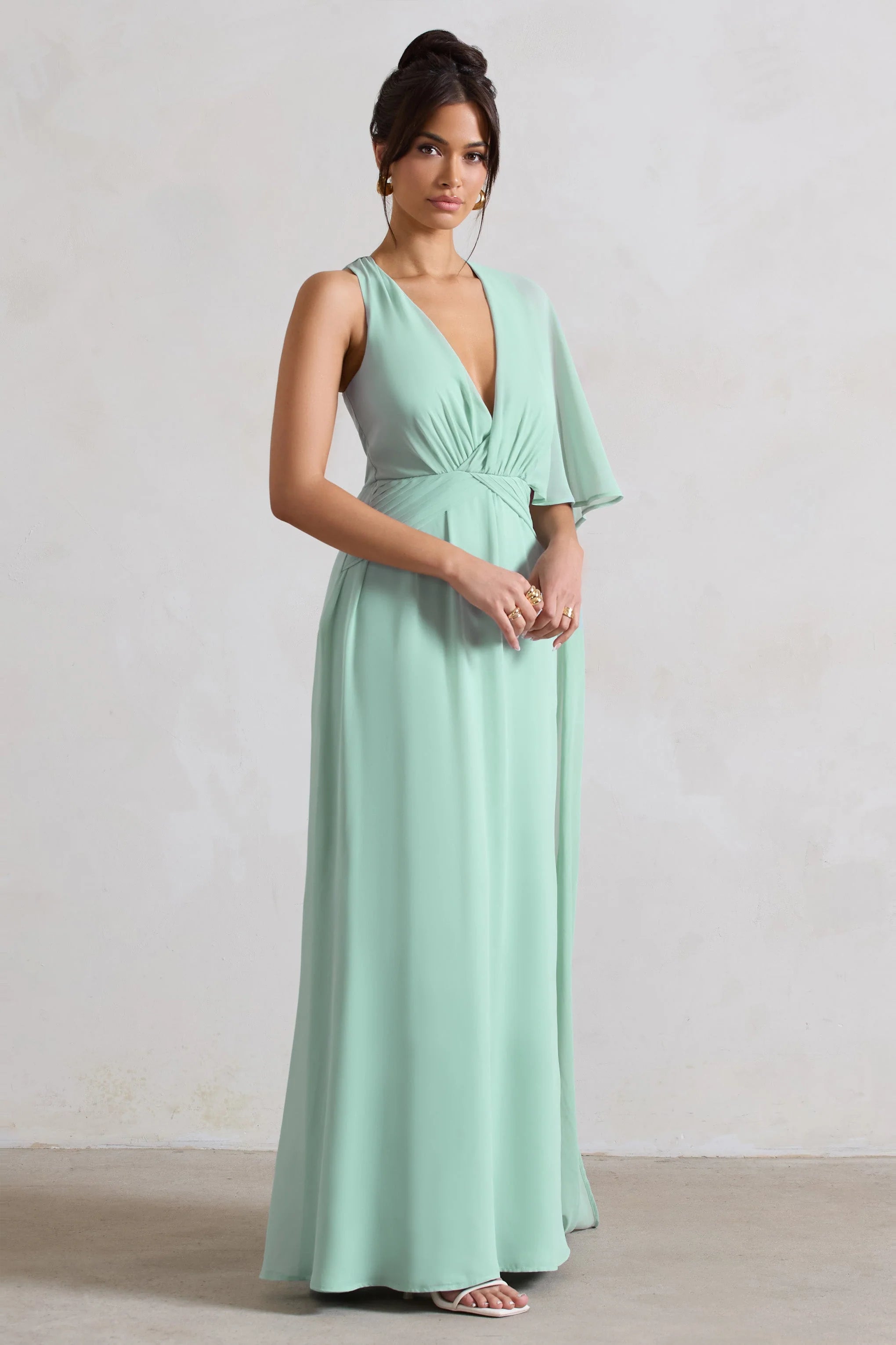A dress only dreams are made of, say hello to Fairytale. This enchanting maxi dress has been crafted in a sage green hue of a premium chiffon fabric thats both lightweight and extremely soft. Defined by an asymmetric cape sleeve, try styling yours with a tousled bun to show off its statement neckline.